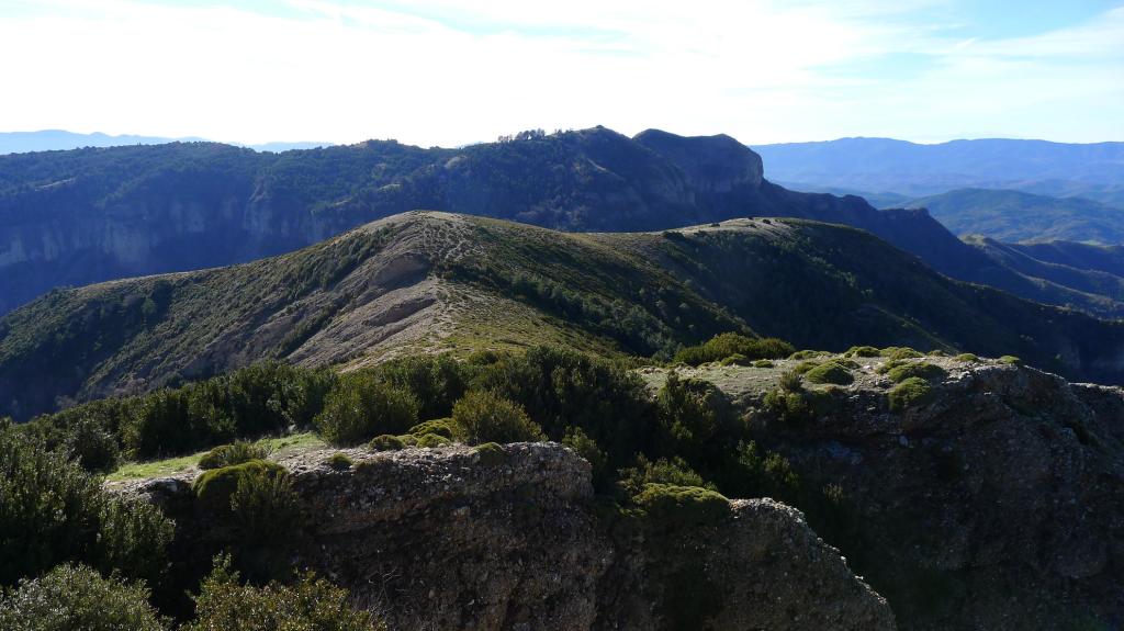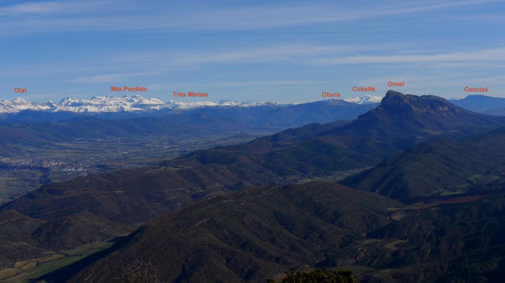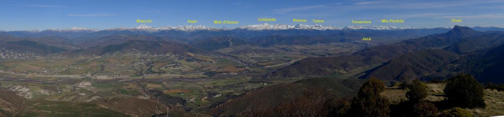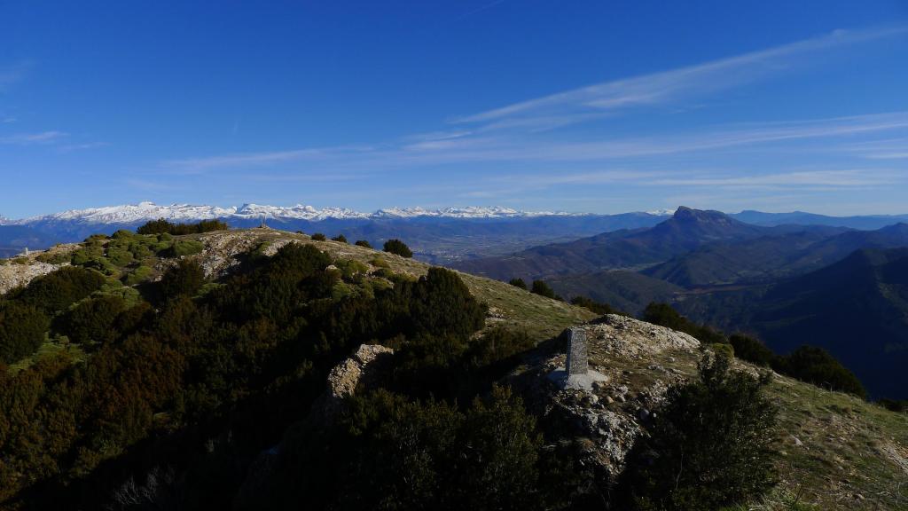 En cuello Betito (1373m 0h36′) se gira a la derecha ascendiendo por la ladera de erizones hasta tomar la cresta, pasar una loma secundaria, y llegar primero al vértice geodésico y finalmente a la punta de la cima (Cuculo 1549m 0h56′), donde la vista del valle del Aragón y el Pirineo es espectacular.