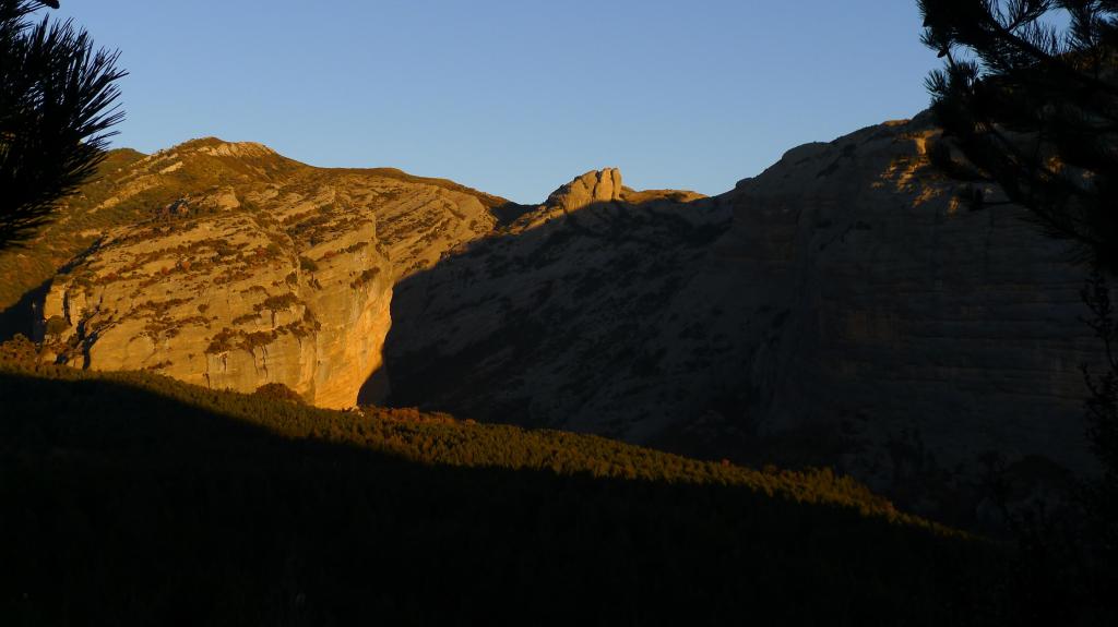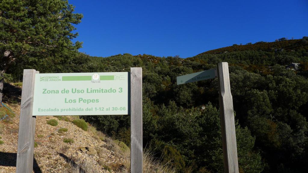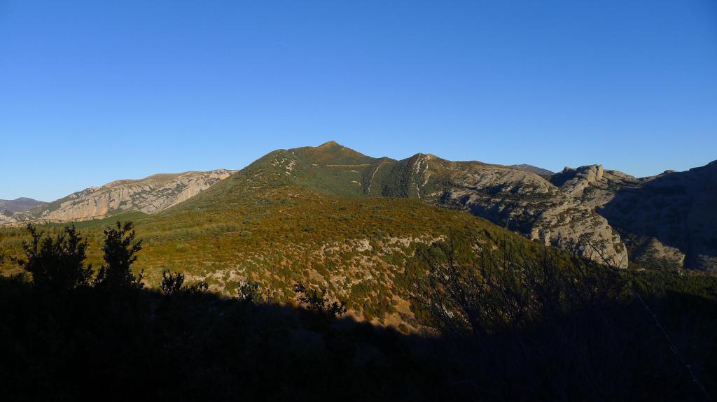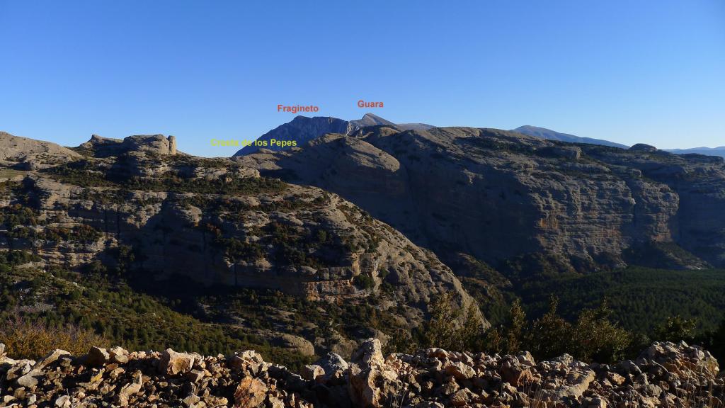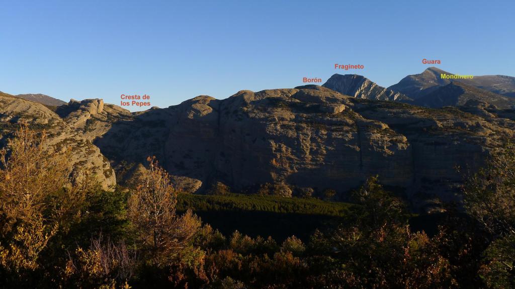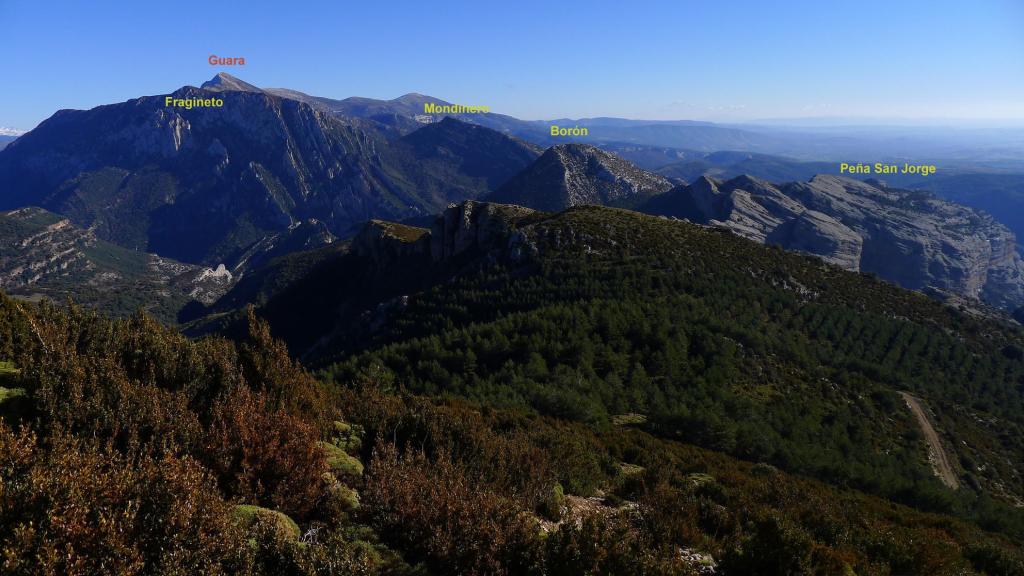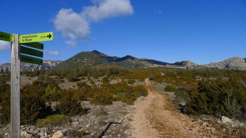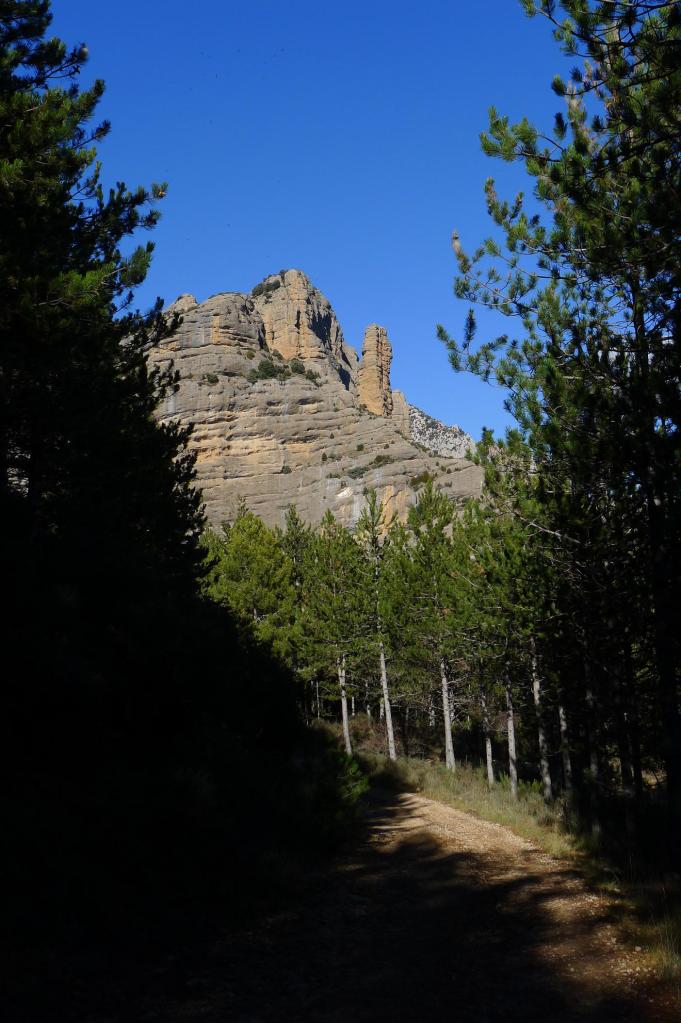 Continúo hasta una nueva bifurcación en una pronunciada curva a derecha (875m 0h43′); después bajaré por el ramal de mi izquierda, ahora sigo la pista a la derecha, por pinar y con vistas a los mallos de los Pepes. En un nuevo cruce dejo la pista hacia Santa Eulalia a la derecha (1023m 1h02′) y cambio de dirección suroeste a noroeste. Así hasta el cruce de la pista a Barluenga (1026m 1h16′). Tomo dirección norte por zona más despejada y ya tengo a la vista la montaña del Matapaños.