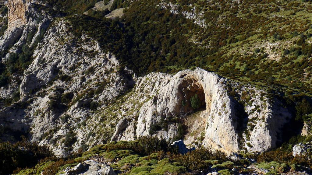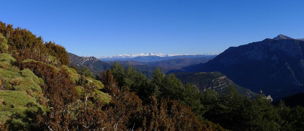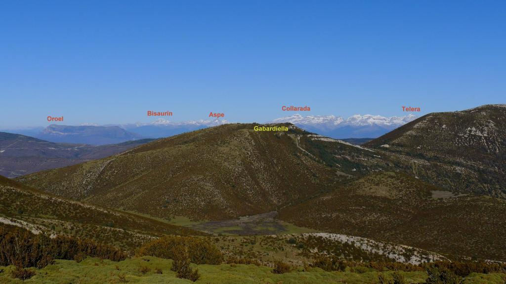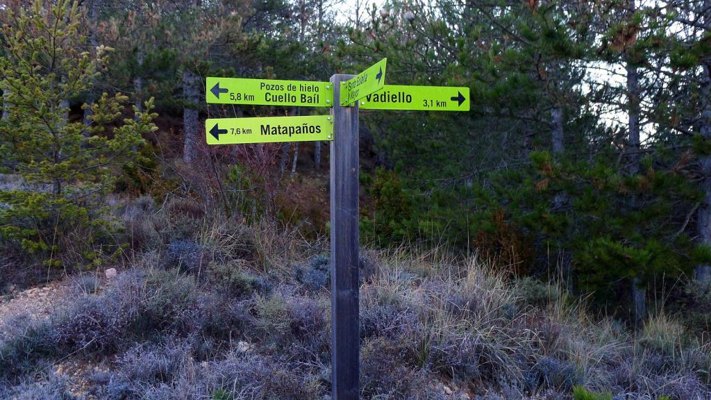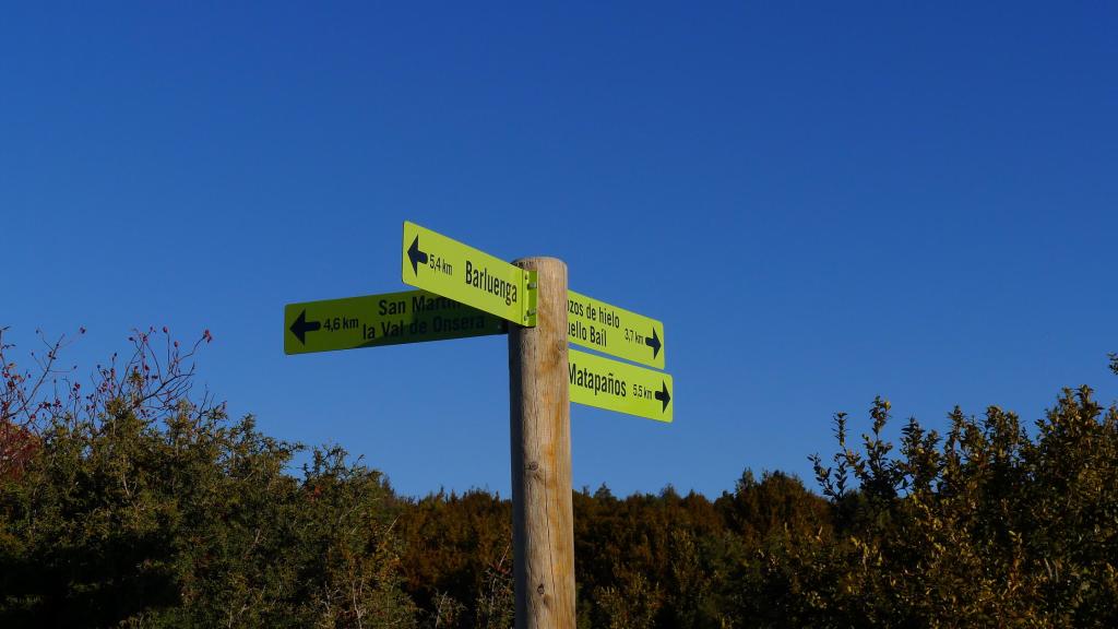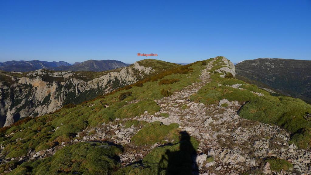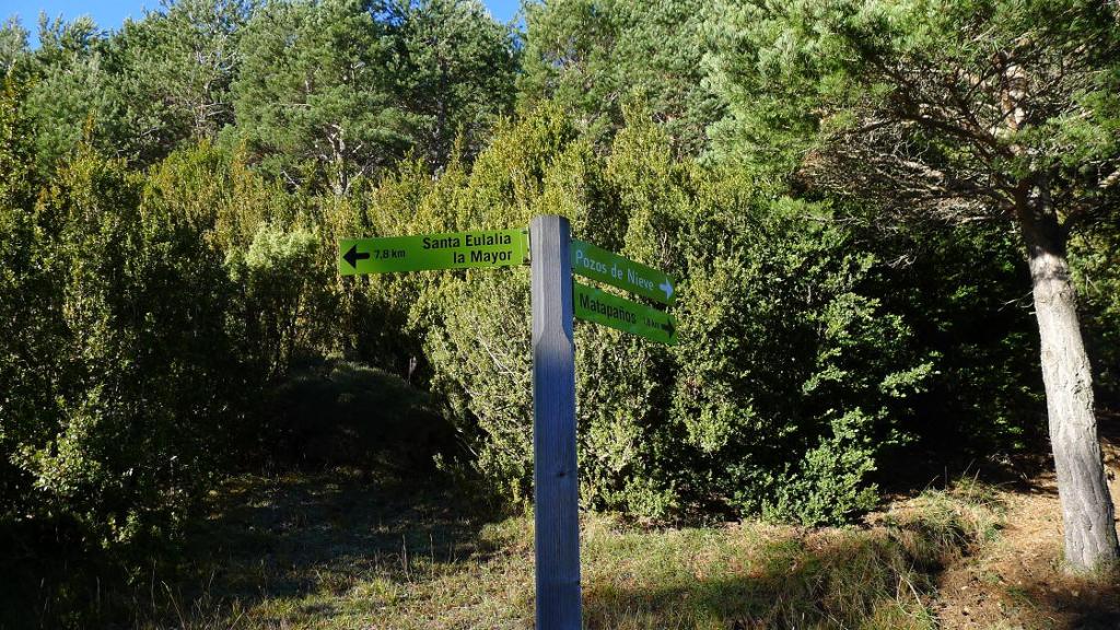 Inmediatamente cruzo la pista para entrar en la senda que sube la ladera del Matapaños por el pinar. Se pasa junto a dos pozos de nieve (1350m 2h24′) y, por terreno más pedregoso y con vistas más abiertas al Pirineo, se llega a la larga cresta. Primero se traspasa una punta sur y, finalmente, la cima del Matapaños (1532m 2h56′), buena atalaya en un día de perfecta visibilidad como hoy.