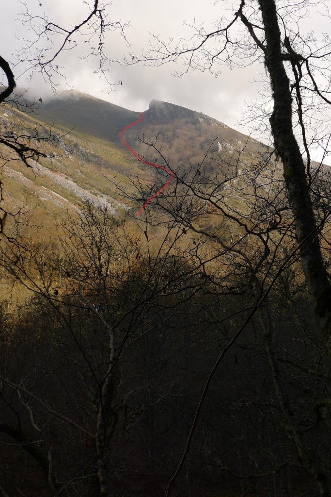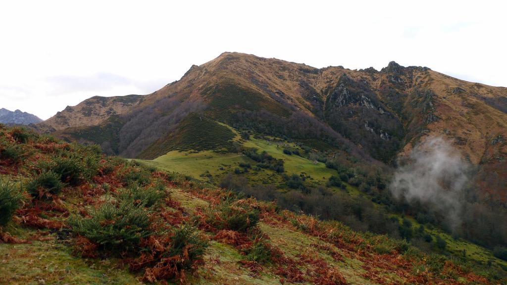 A partir de aquí la senda está difusa y embarrada; la dirección es clara hacia el E, al collado Traslafuente, pero no accedemos al collado, sino que vamos un poco a su izquierda y hacemos un fuerte giro a la izquierda (1080m 1h16′) antes de llegar a la divisoria (NW).