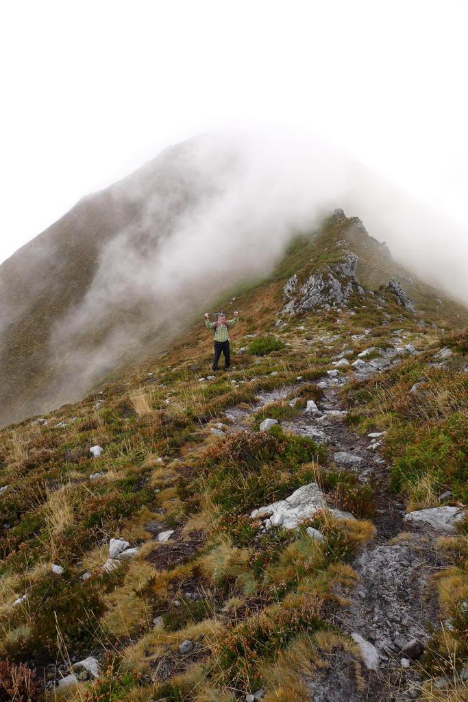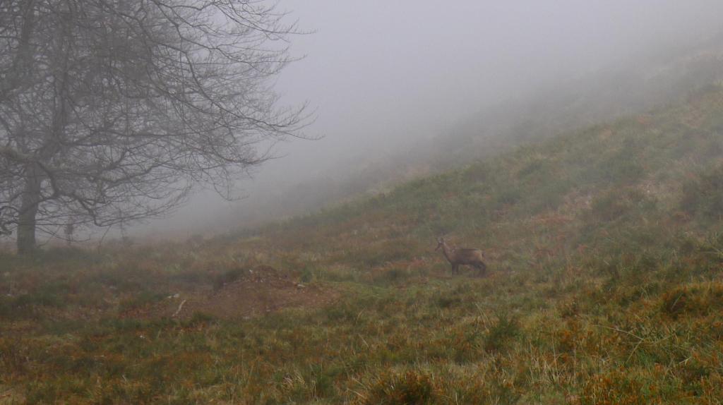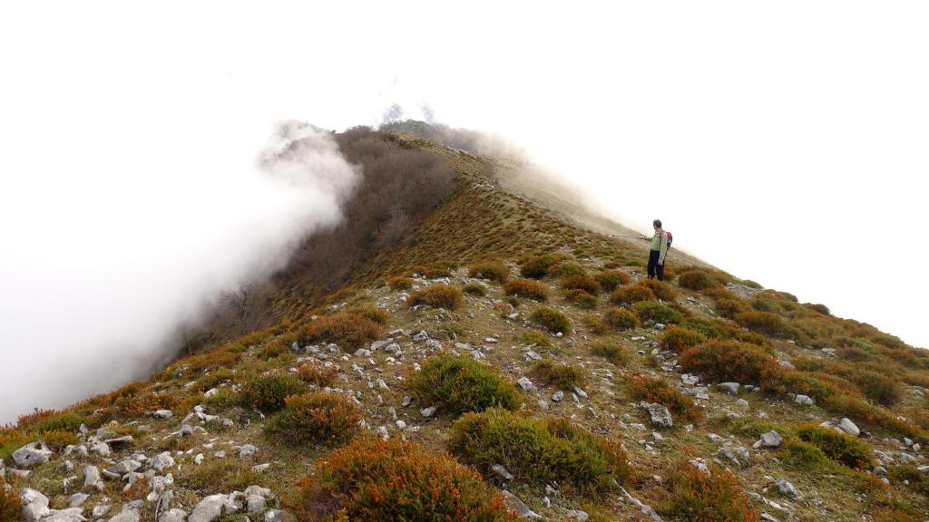 Avanzamos por una senda, faldeando por zonas más rocosas, con señales amarilla-blanca de PR, que nos lleva hacia unos pequeños bosquetes muy chulos, con algunos tejos y acebos. Después ya encaramos la ladera hacia el N por una zona más kárstica y vemos una señal que nos indica ir hacia la cresta. Sin llegar a la cresta se faldea bajo la parte más rocosa y al final accedemos a la cresta en el collado tras el pico la Verdad. La senda discurre ahora por el lomo herboso y la niebla nos rodea por ambos costados.