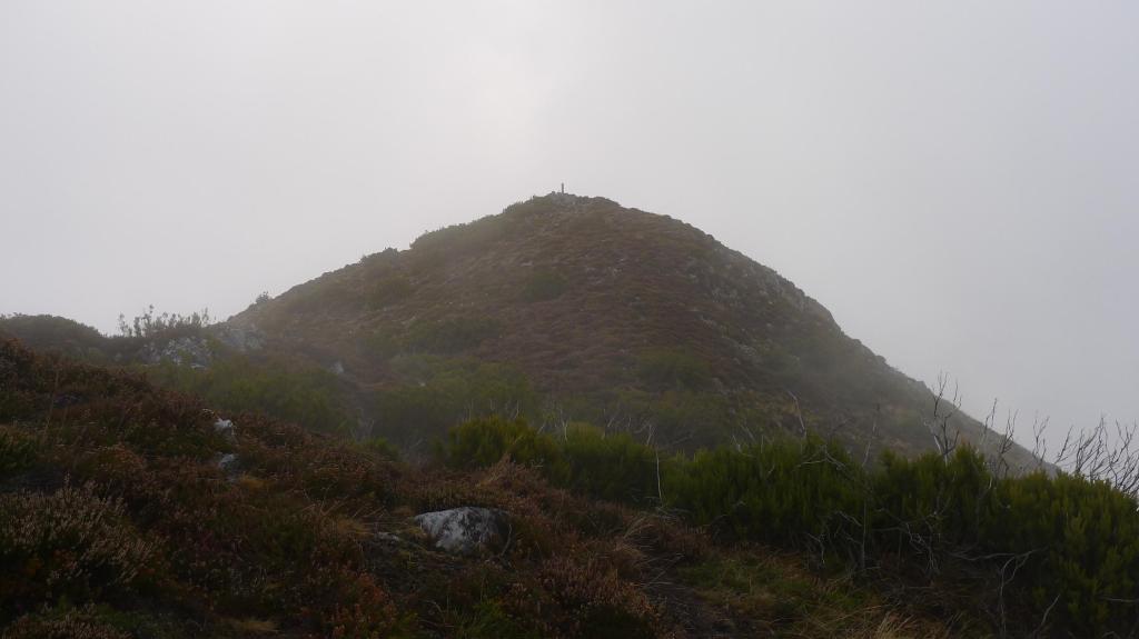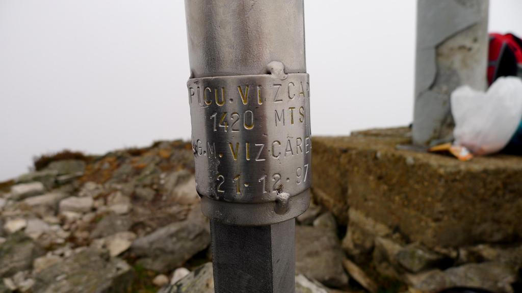 Superamos el pico Cabezu (1369m 2h02′) y nos enfrentamos a la pala final por senda entre brezos hasta la cima del Vízcares (1421m 2h17′), donde hay un par de Belenes, un vértice geodésico y un poste metálico, pero no podemos ver nada más a nuestro alrededor.