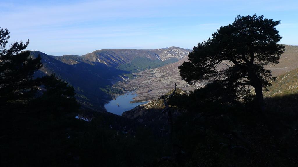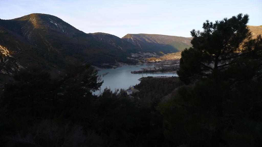Aparco en la antigua Hospedería de Arguis (980m) en la orilla este del embalse, que está completamente congelado por la ola de frío que hemos sufrido esta semana. Cruzando bajo la autovía sale una senda señalizada que asciende con amplias lazadas por el pinar. El camino es muy claro. Hay un punto en que el sendero ha sufrido un desprendimiento y se pasa sin mayores problemas por la roca en el lado izquierdo, con una cadena (1200m 0h22′) casi innecesaria.