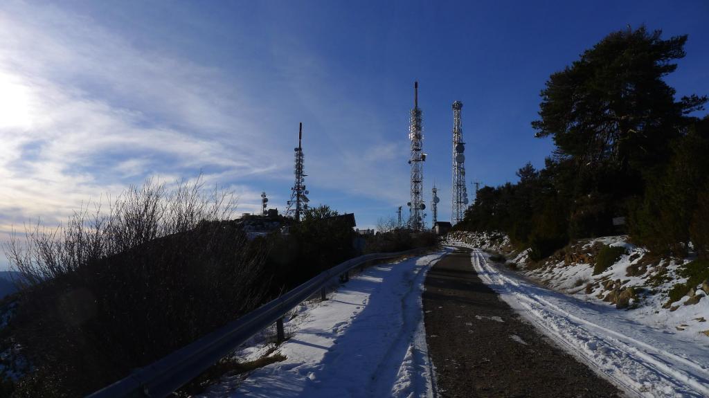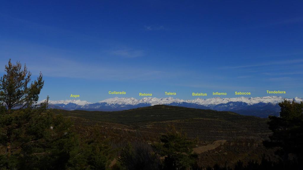 Se llega a una bifurcación (1560m 1h13′) con poste pero sin cartel, que a la derecha llevaría hacia la ermita de Ordás. Inmediatamente desemboco en la carretera (1590m 1h15′). El pico sur con las antenas queda a mi derecha y me dirijo al pico norte por la carretera de la que sale un camino a la derecha (Pico norte 1630m 1h35′). Amplias y espléndidas vistas del Pirineo.