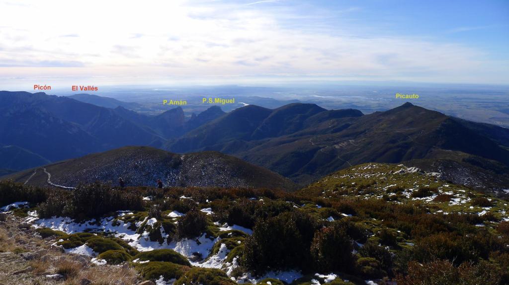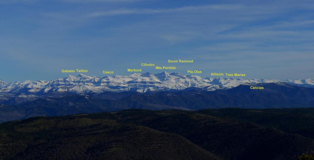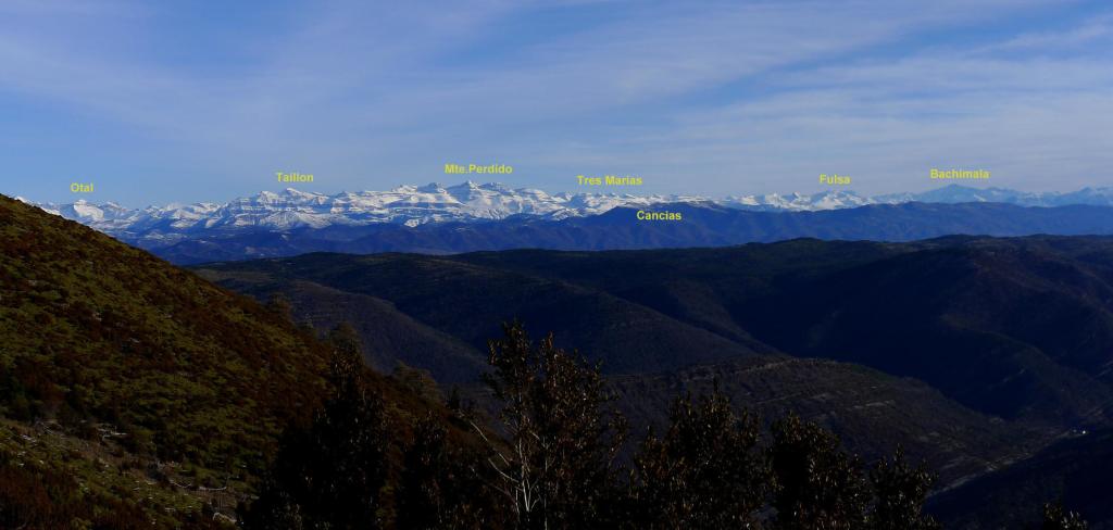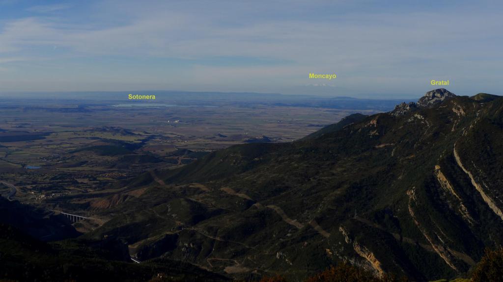 Vuelvo sobre mis pasos al pico sur (1619m 1h59′). Rodeo la instalación de antenas y echo un vistazo a las mesas de orientación. Allí me encentro con una pareja de corredores que me recomiendan el recorrido circular hasta el Mesón Nuevo desde donde sale un camino que regresa a Arguis. Como aquí han puesto un cartel de batida de caza (muy agudos los cazadores ponen el cartel en la entrada superior del sendero, siendo que los caminantes empezamos desde abajo, desde Arguis, donde no había ningún cartel) decido seguir su consejo y evitar la zona de caza.