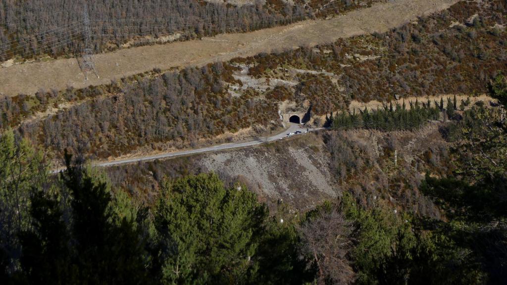 Subo otra vez al pico norte y continúo el camino hacia el norte. Fácil de seguir, se introduce por el lomo norte de la sierra, por un precioso pinar nevado en el que hay huella de paso e hitos de vez en cuando. Pasa el camino junto a una pronunciada curva de la carretera (1350m 2h50′) y enseguida se ve el viejo túnel de la Manzanera y el Mesón Nuevo (1260m 2h58′).