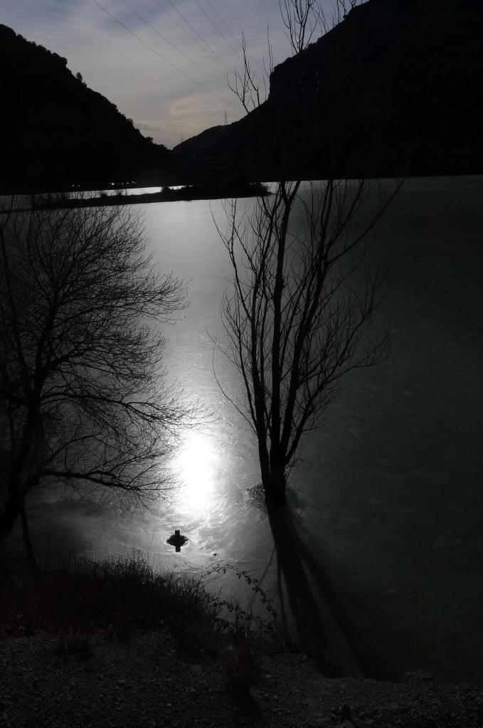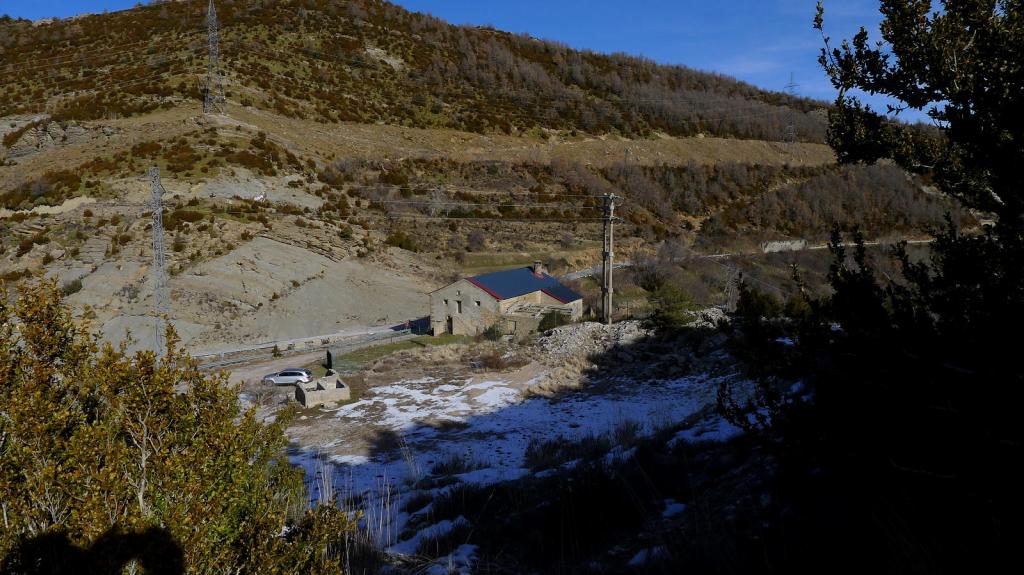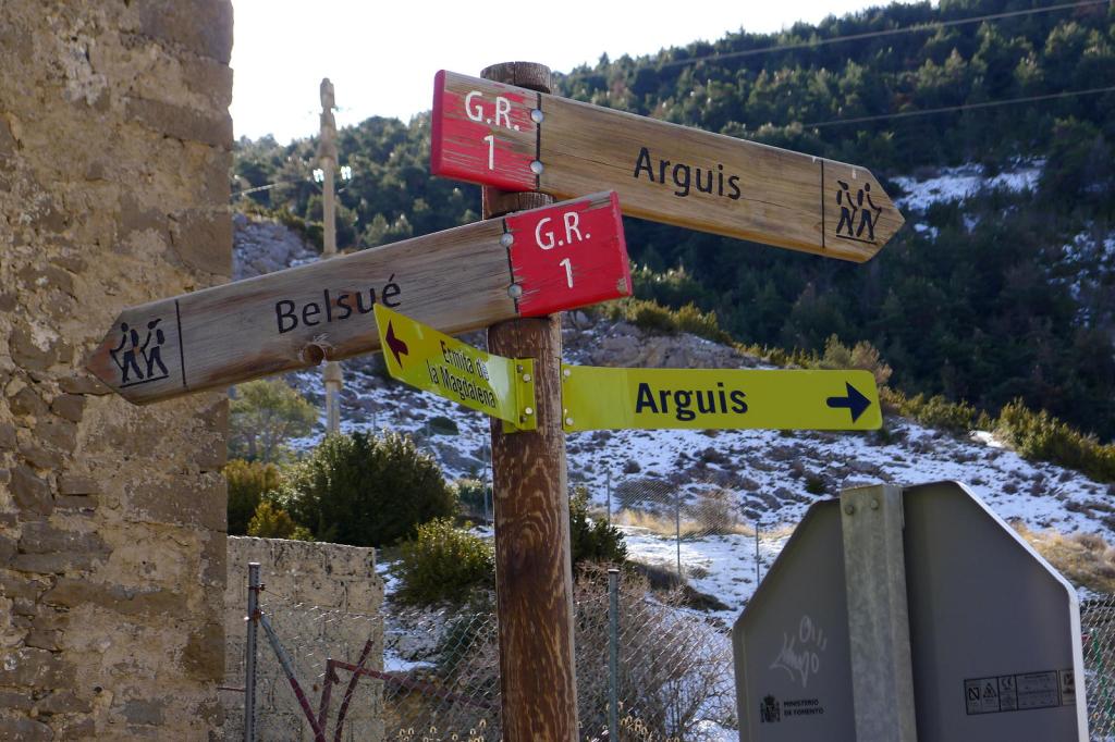 El camino se une a los postes amarillos que indican la presencia del gasoducto (1135m 3h29′) y, finalmente, por un paisaje cada vez más humanizado, llego al pueblo de Arguis (1045m 3h47′). Desde aquí tendré que avanzar por la carretera hasta la orilla del embalse y al aparcamiento de la Hospedería (980m 4h10′)