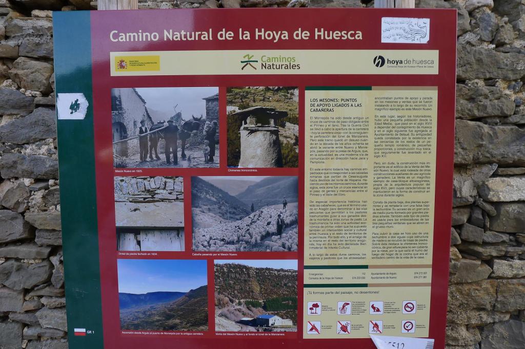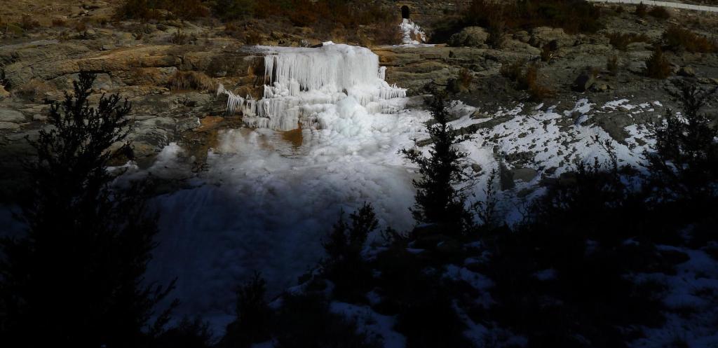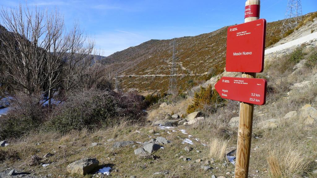 A la izquierda (oeste) del Mesón Nuevo sale una pista y a su derecha una senda señalizada como «Camino Natural de la Hoya de Huesca», que coincide con el GR1. Tomo la senda; un poco más abajo desemboca en la pista. Hay una espectacular cascada helada. Se pasa sobre uno de los nuevos túneles de la autovía (1190m 3h23′), se esquiva un apoyo de alta tensión por la derecha, y la senda empieza a recorrer terrenos margosos y áridos hacia Arguis. Hay postes e hitos bien colocados para no perder la ruta.