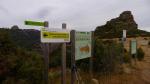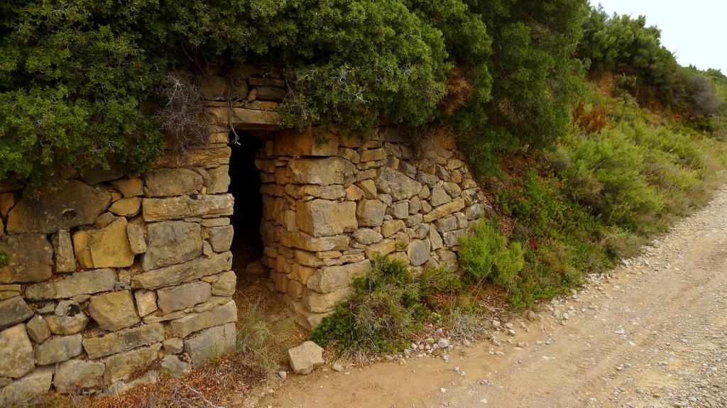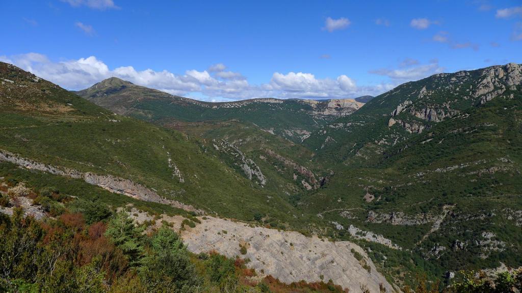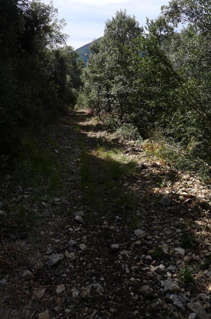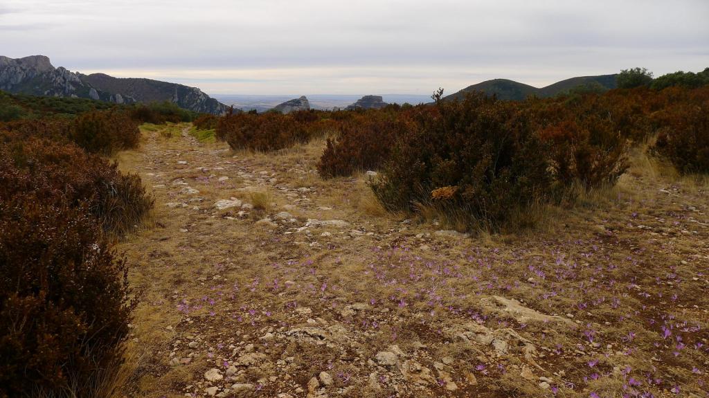 Una pista deja el refugio a la izquierda y luego entronca con otra pista de la CHE (1015m 2h37′) que viene de la derecha. Hay un buen tramo de pista hacia el oeste y luego en curva hacia el sur, hasta unirse con otra pista de la derecha (1180m 3h12′) en una zona llana como una especie de collado. En unos metros sale a la izquierda un camino que desciende con fuerte pendiente entre un bosque de encinas.