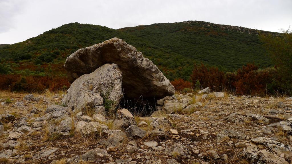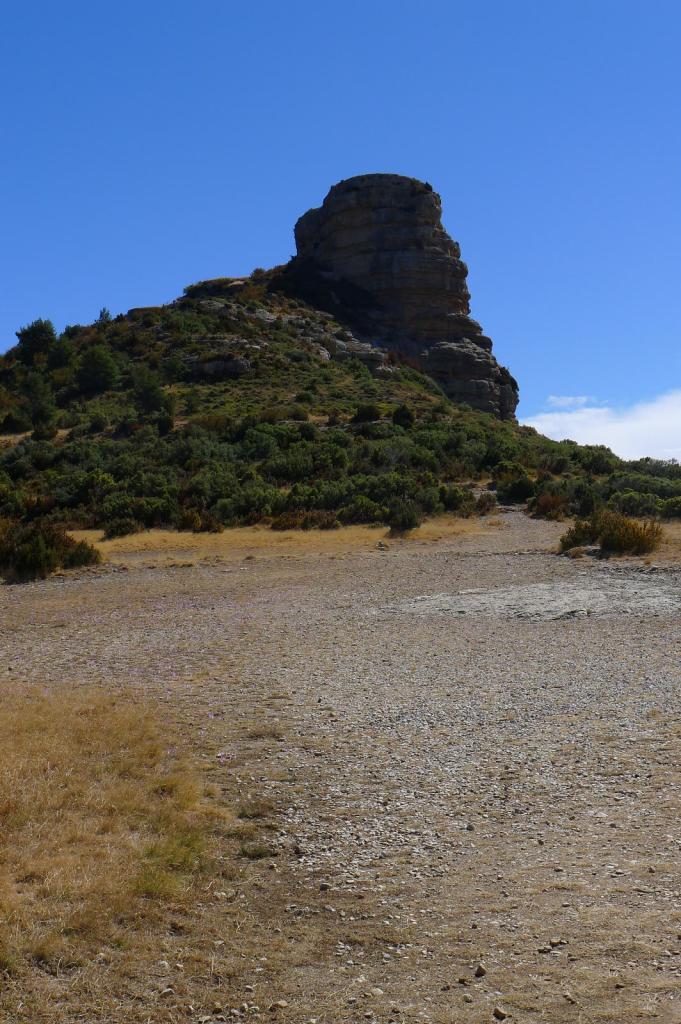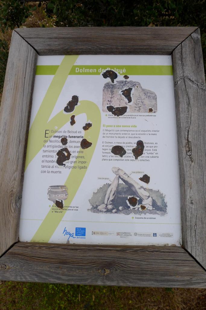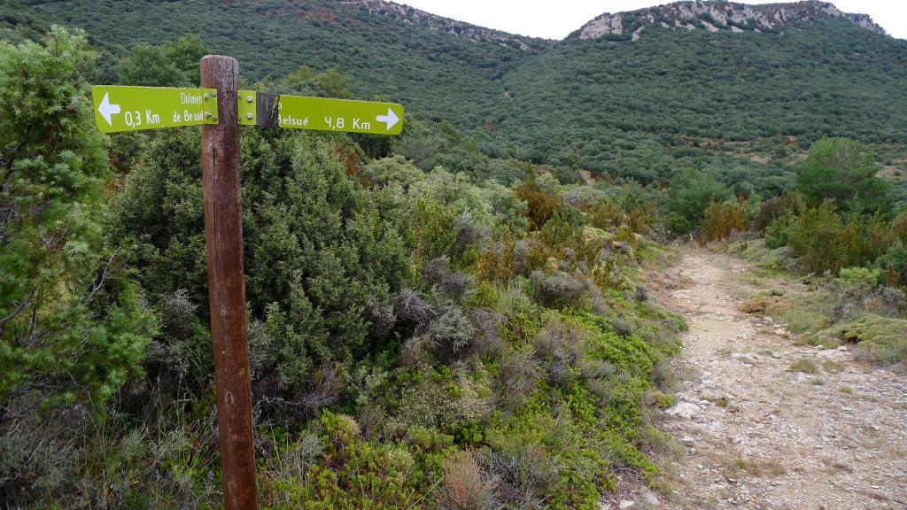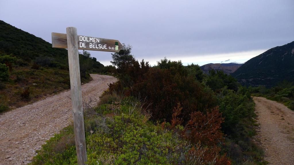 Aparcamiento de la Peña San Miguel (1010m). Tomo la pista al norte y, pasando junto a un curioso refugio en la ladera,  llego al mirador del Salto de Roldán (1030m 0h11′). Unos metros más adelante me desvío a la derecha y después por una senda a la izquierda (1025m 0h16′) que avanza por un bosquecillo de pinos. Atravieso dos riachuelos que forman el barranco de la Masa de Sabue (910m 0h29′). La senda continúa hasta el dolmen de Belsué (975m 1h02′) que queda a la derecha y merece una visita.