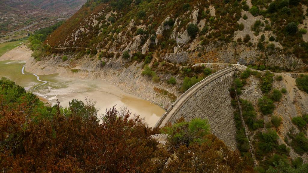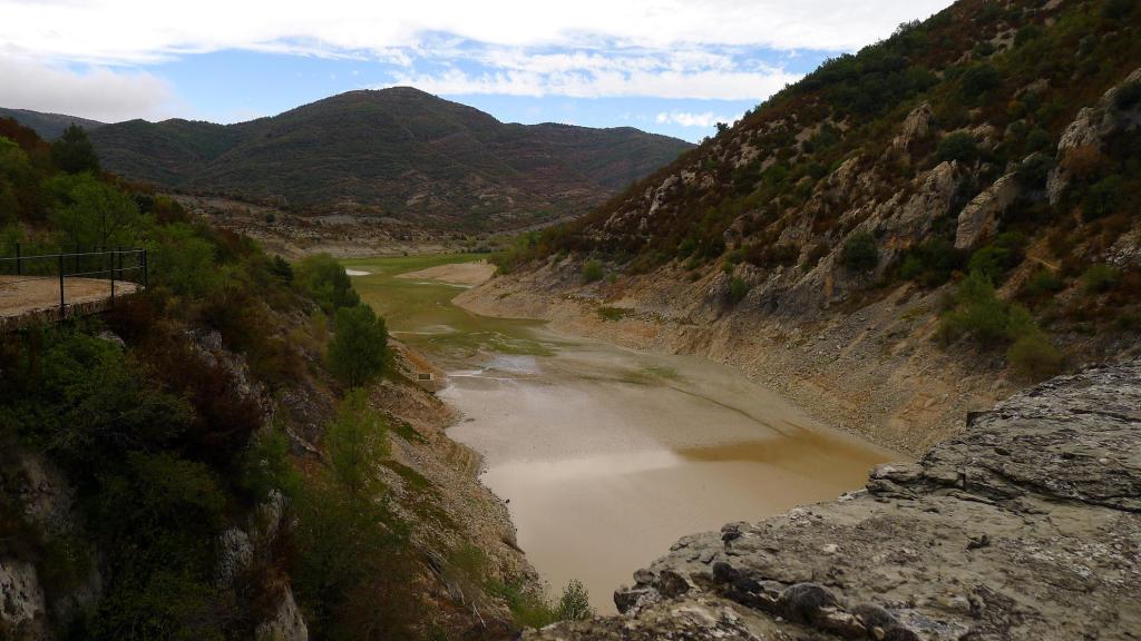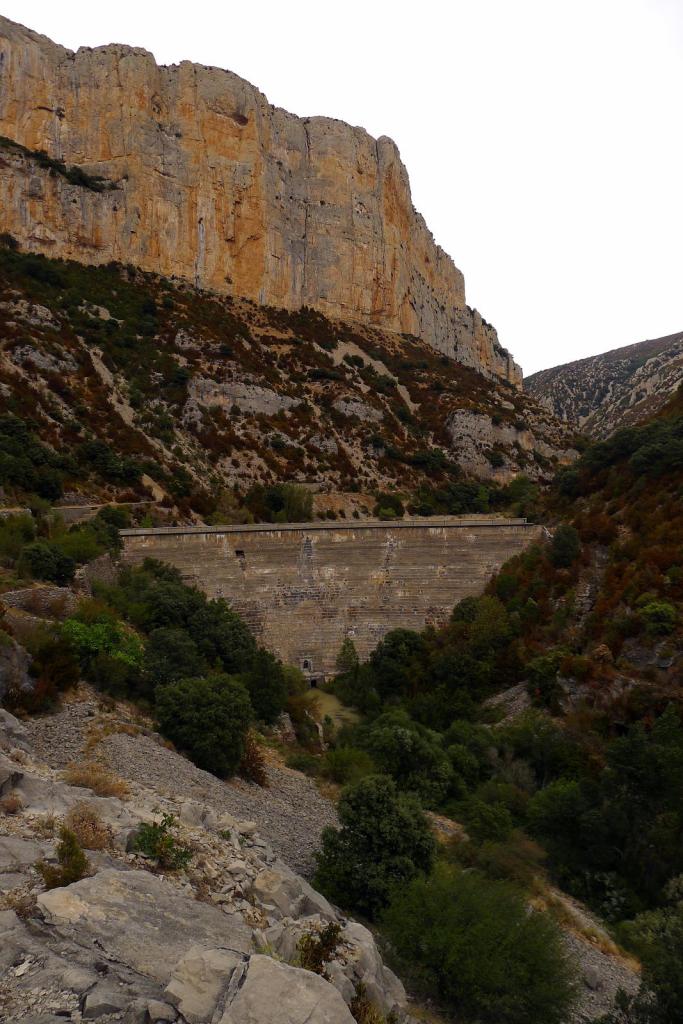 Un poco más adelante me desvío a la derecha, hacia la presa de Belsué; volveré por la senda de la izquierda. La senda avanza por un bosque de encinas por encima del encañonado cauce del río Flumen hasta la presa de Cienfuéns (850m 1h45′).