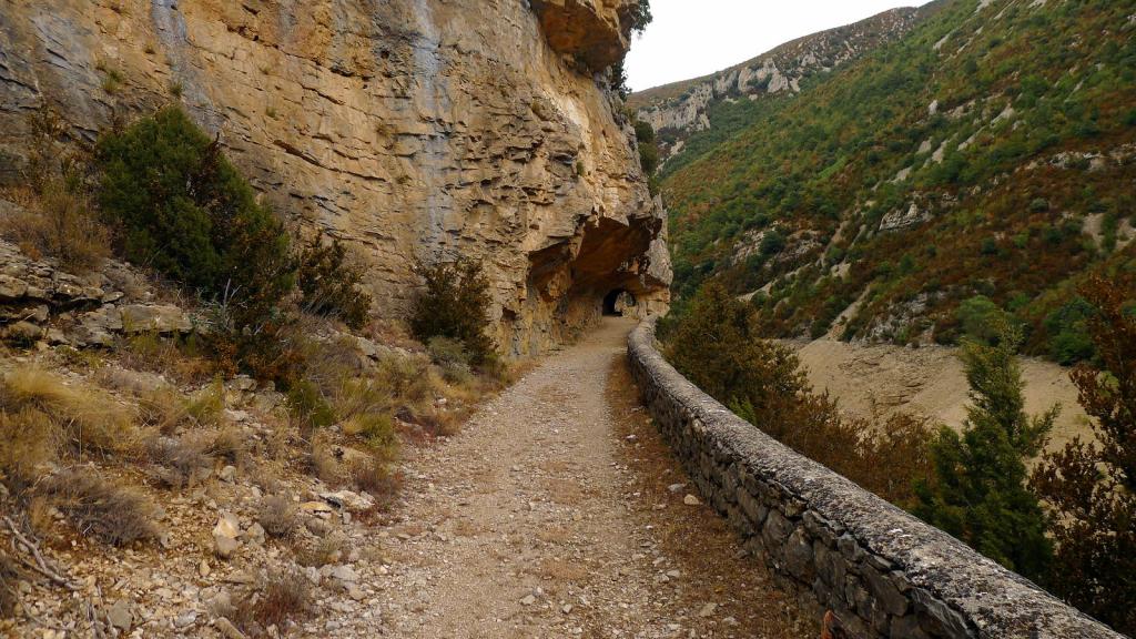 Allí empieza un camino sobre el seco embalse y bajo verticales paredes  abriéndose paso mediante varios túneles y terminando en la presa de Belsué (895m 2h16′), desde la que se domina el más abierto valle del Flumen. Nada más pasar la presa hay unas escaleras a la izquierda que suben al refugio de Nuestra Sra. de Belsué (1005m 2h29′).