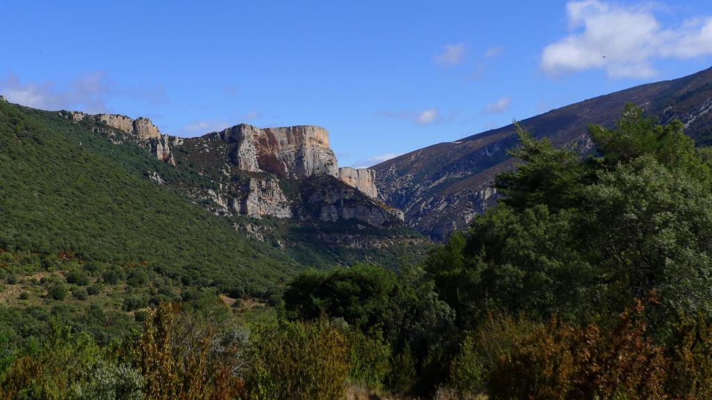 Ruta senderista sencilla pero larga por algunos entornos espectaculares de las sierras exteriores del norte de Huesca, con algunos tramos de pista menos atractivos. Aparco bajo la Peña San Miguel, el mallo occidental del Salto de Roldán, al que llego desde Nueno, pasando por el pueblo de Sabayés y desviándome a la derecha antes de llegar a Santa Eulalia de la Peña.