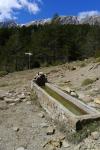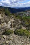 Desciendo al SO hacia un amplio collado donde, un poquito más abajo, encuentro la senda (2010m 2h10′), muy embarrada, bien marcada con hitos, por zona abierta, bajo la vertical pared del Turbón. Enseguida un cruce (1975m 2h16′) la senda a la dercha sube al Turbón, yo bajo a la izquierda. En el manantial de Fuente Canals ( 1780m 2h38′) la senda desciende por el propio barranco, pero cuidado que hay que salir del barranco a la derecha para seguir la senda otra vez por el pinar.