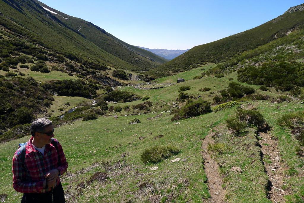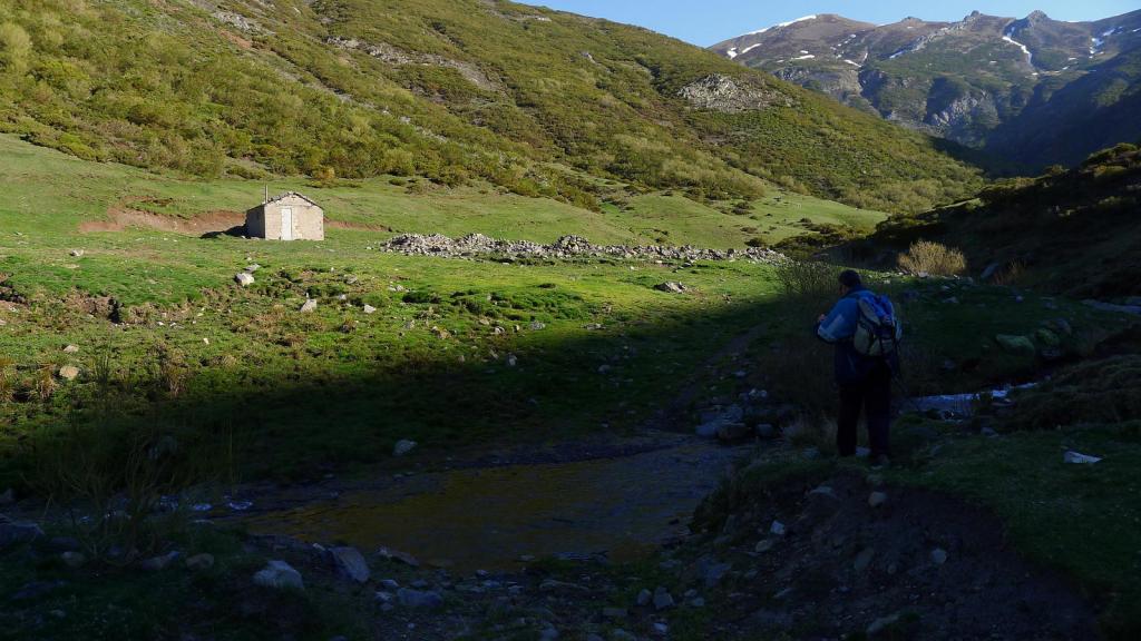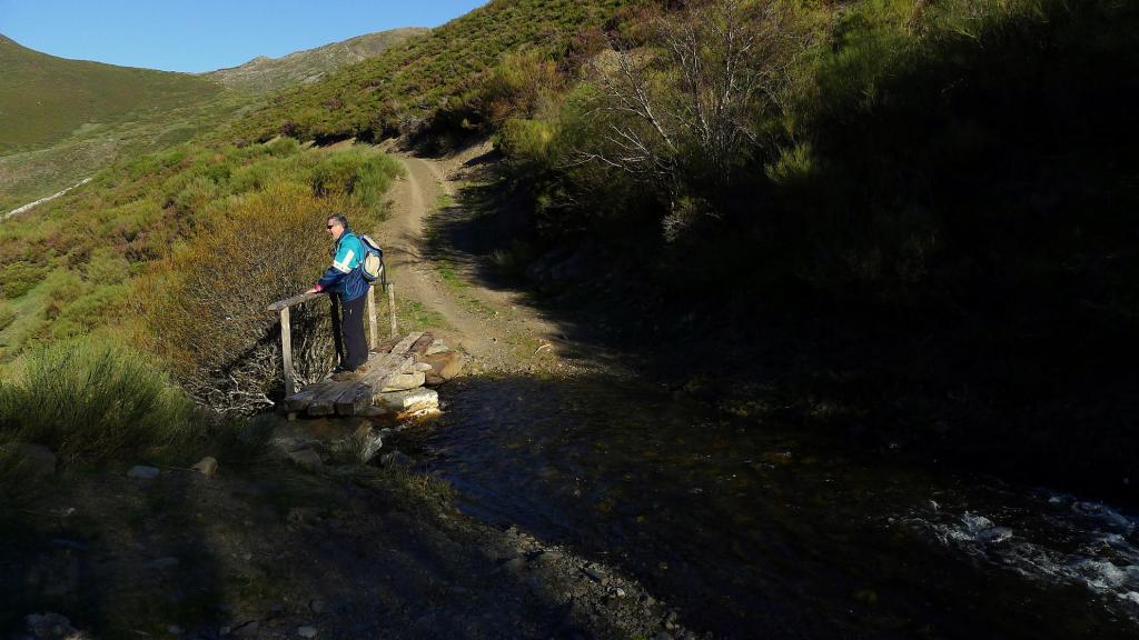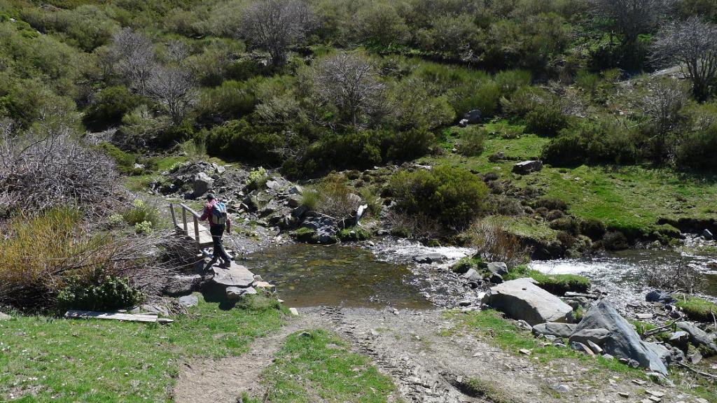 Hacemos el descenso un poco más recto hasta la bifurcación de hitos y luego la misma ruta hasta el refugio. En vez de cruzar el río seguimos por la senda de esta orilla derecha; la senda es clara pero a veces está un poco cerrada por las escobas. La senda llega hasta la majada junto al arroyo Tonín donde desemboca la pista que viene del collado Sierra Bermeja, al oeste. Cruzamos el puente (1475m 4h36′) para retomar la pista que desciende de nuevo a Tonín (1260m 5h20′)