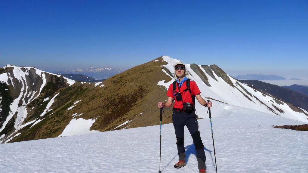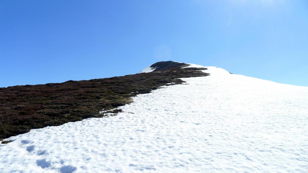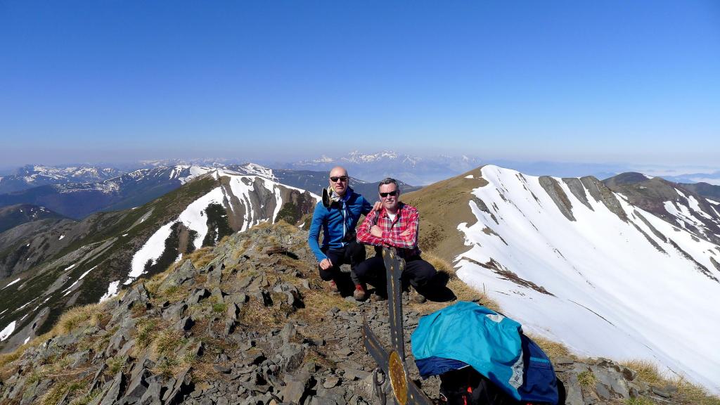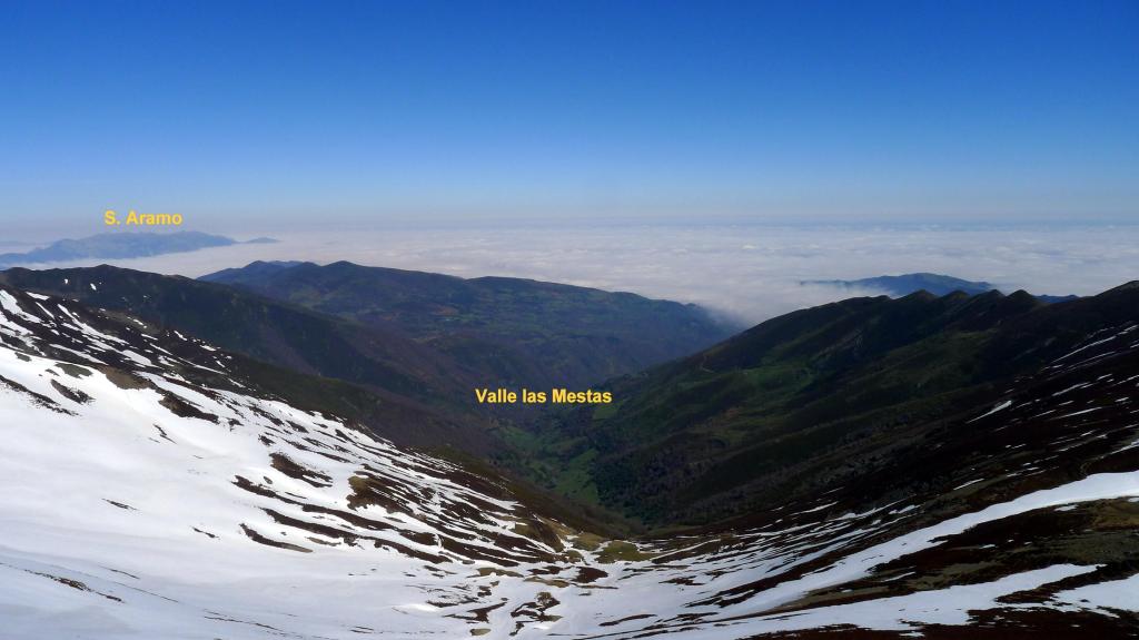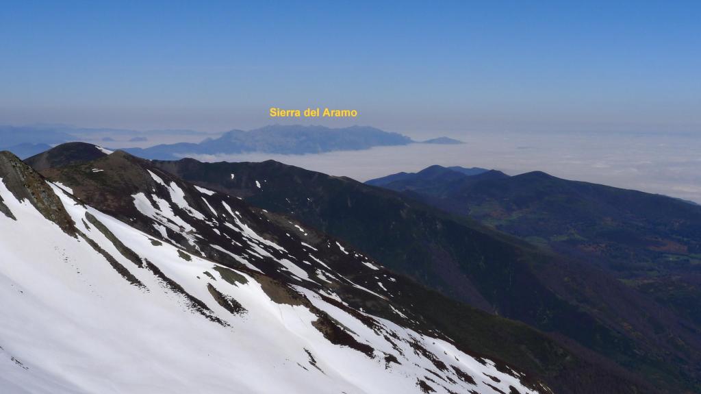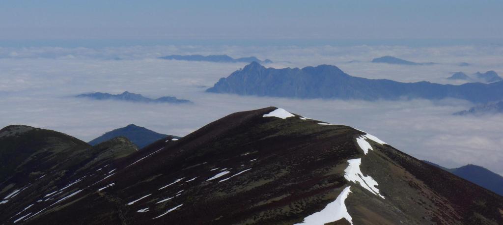 En vez de dirigirnos al collado buscamos acceder a la cresta por donde menos nieve hay, ya que en el collado hay un potente muro de nieve. Sin dificultad llegamos a la cresta (2070m) y rápidamente a la cima del Estorbín (2123m 2h33′) (Cruz asturiana y buzón del grupo de montaña de Grado). Hay mar de nubes hacia Asturias, pero nosotros tenemos una vista espléndida.