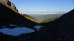 Desde aquí hay que seguir hacia el este (junto a un abrevadero), pasando de nuevo a la orilla izquierda del barranco hay senda, el vallecito se estrecha, pero después se ensancha en una gran pradera. Ya se ve el collado Marañán. Al final de esta pradera el barranco, prácticamente seco, se vuelve a estrechar (1795m) y la ruta más cómodo (sin senda pero con hitos) discurre siempre por el fondo del valle y por la margen derecha. En la parte final se asciende por un lomo, un poco hacia mi izquierda, con una fuerte pendiente de tierra y piedrilla que da acceso a la divisoria un poco al norte del collado Marañán (2065m 1h34′).