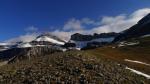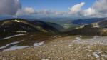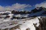 Ya sin camino, es cuestión de seguir el suave lomo (NE, algún hito) hacia la zona rocosa que parece ser el Somola Bajo, pero cuya cima no se ve todavía. Tras la zona de lomo herboso se encuentra una pala pedregosa, algo incómoda ya que hay nieve que no llega a cubrir las piedras y además las piedras están cubiertas de una fina capa de humedad que todavía está escarchada y resbala.