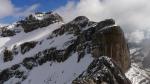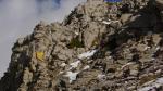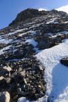 Más arriba se ve una zona rocosa más vertical que defiende un hombro superior aún fuera de la vista. Desde lejos esta pared rocosa parece complicada, aunque según me voy acercando aprecio que es roca muy rota y con canales bien accesibles. Hay una primera canaleta con una placa de «reserva de caza»; yo ataco otra un poco más adelante y más ancha que no ofrece dificultad. Así llego a la cresta rocosa y después la cresta se ensancha en un amplio hombro y una suave pala nevada con la cumbre a la vista.