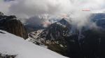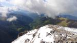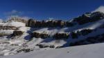 Calzo crampones, cuando voy solo no me arriesgo aunque haya pendientes suaves. A mi izquierda las vistas de Collarada, Collaradeta, Peña Nevara y las murallas que llevan a Somola Alto se ven espectaculares. La pala nevada me lleva a la cima de Somola Bajo (2568m 2h51′). Me asomo por su vertiente este, da miedo acercarse. La vista del valle de Acumuer y la Peña Retona enfrente es impresionante, lástima de nubes que se desarrollan desde el valle y tapan una visión clara. Observo el Somola Alto, me parece defendido por paredones inaccesibles, debe ser posible subir aunque no fácil.