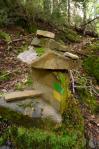 Enseguida hay que vadear el barranco subsidiario de Piecerbera y el camino asciende por el pinar con algunas hayas en la ladera izquierda del barranco de Villanúa o Bozuelo. Algunos prados dan un descansito, pero en general asciende con fuerza. Tras atravesar otro riachuelo (1610m 0h38′) me encuentro paralelo a la pista de la Trapa. Paso el barranco de Villanúa por una pasarela de madera y alcanzo el refugio del Cubilar de la Espata (1690m 0h48′).
