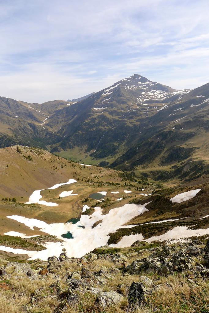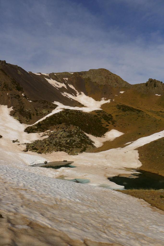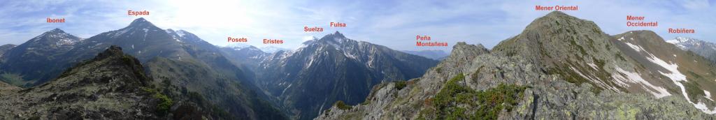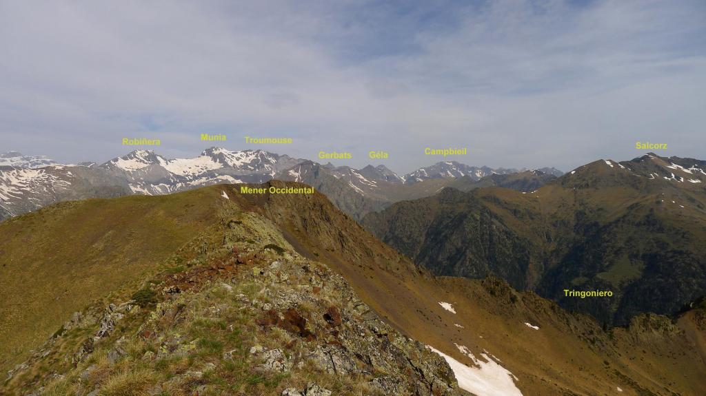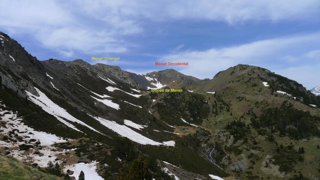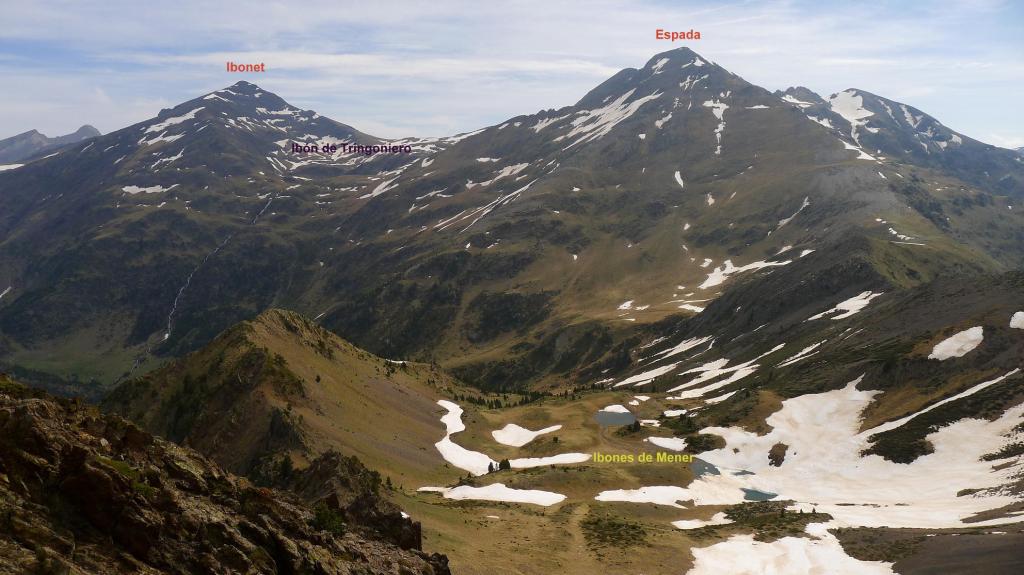 Un circo recóndito y solitario, en lo alto de un vallecito subsidiario del valle de Tringoniero, con 3 pequeños ibones y cerrado por dos picos de crestas agrestes; esta es la ruta que descubro hoy, el circo de los ibones y picos de Mener. Se asciende por el barranco de Tringoniero, un valle estrecho y profundo, cuyas aguas descienden potentes y estruendosas en esta época del año; el sendero es menos claro cuando me introduzco hacia el circo de Mener, todavía con algunos neveros, y se llega a los picos recorriendo una cresta que, sin ser difícil, exige atención y esfuerzo físico.