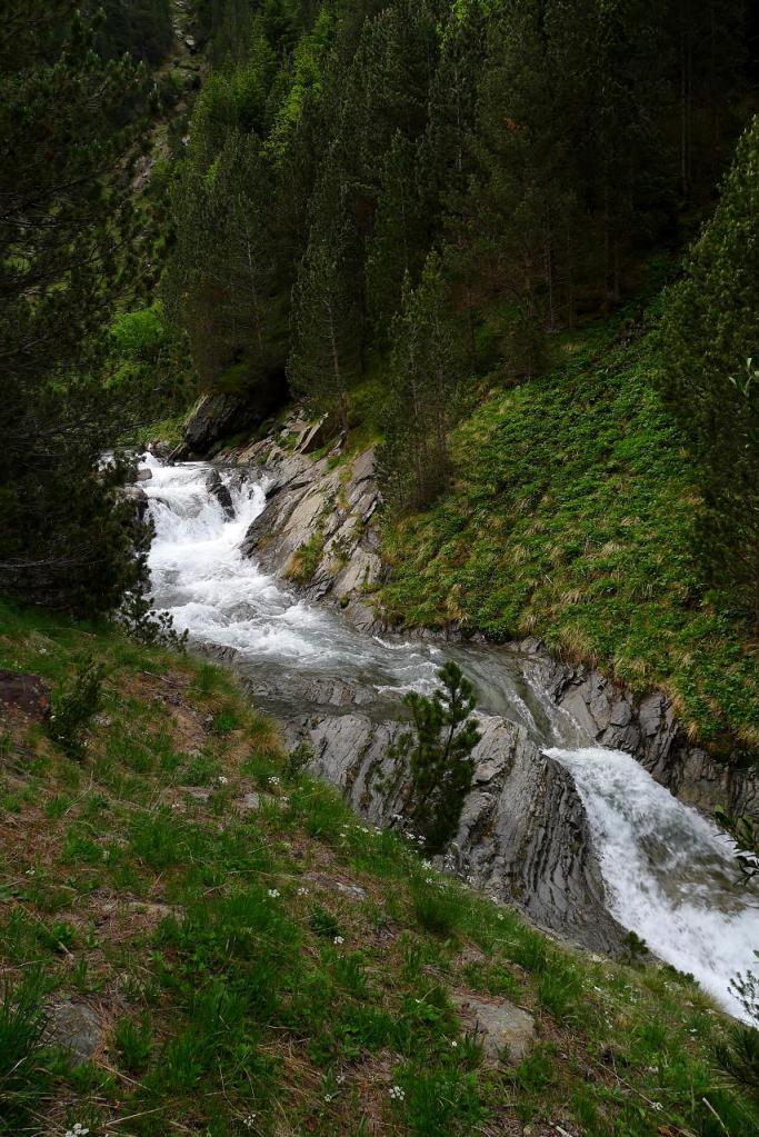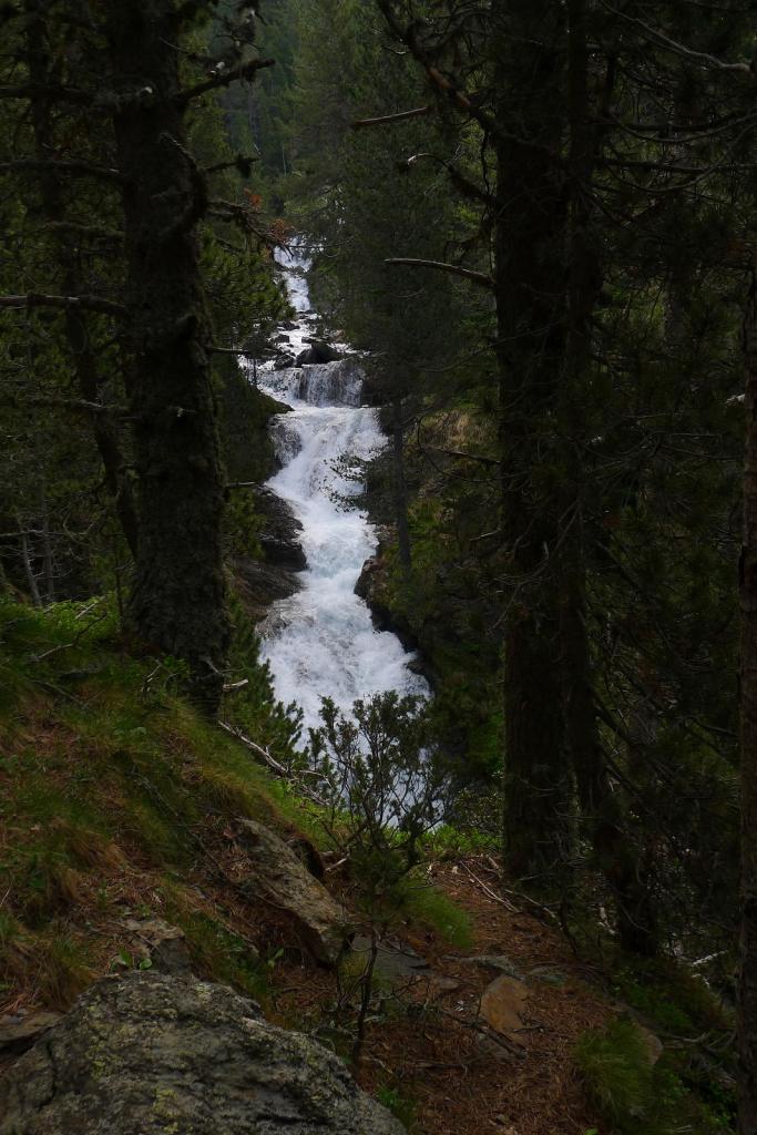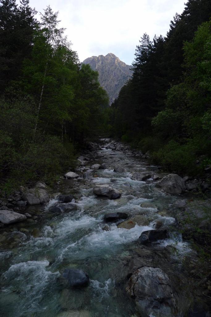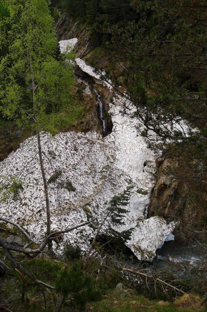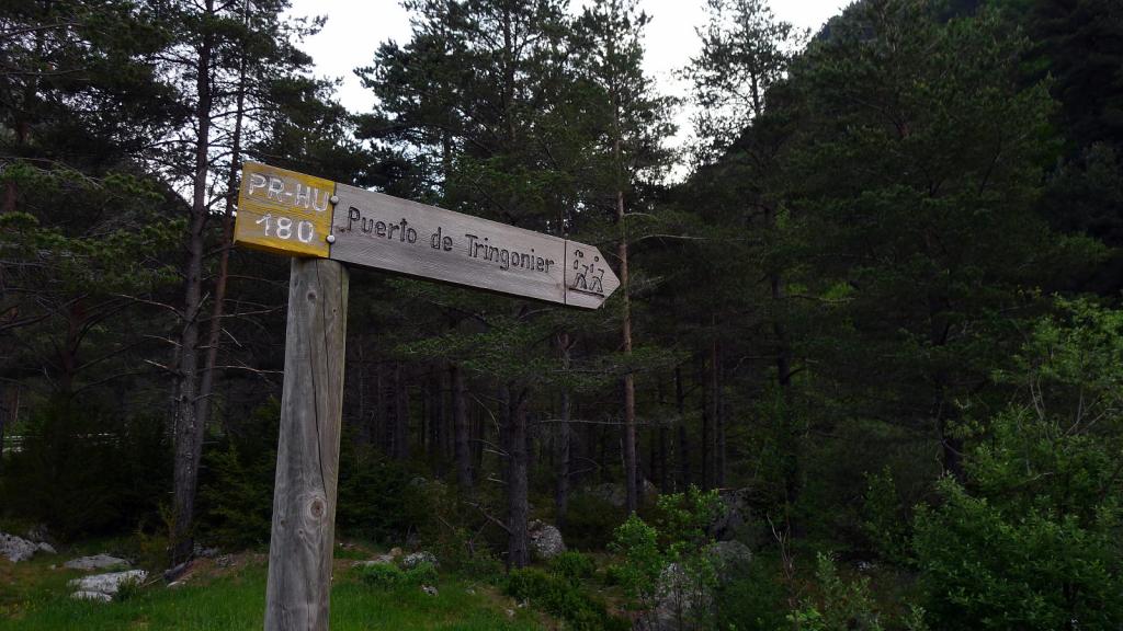 Justo antes de llegar al km.87 de la carretera que va al túnel de Bielsa-Aragnouet se alza el edificio de la antigua aduana (1290m) donde se puede aparcar. Allí está el cartel del PR 180 y un puente cruza el río Cinca. La senda, siempre balizada con marcas amarillas y blancas e hitos, asciende con decisión por el bosque, dominando al principio las frondosas y luego los pinos, a la orilla derecha del barranco de Tringoniero. Se pasa sobre un canal que llevará el agua a la central de Barrosa, luego junto a la borda Ruela (1437m 0h17′). Un alud ha dejado una desolación de troncos barridos y otro barranco lateral todavía está cubierto por una lengua de nieve. El ruido del agua con sus rápidos y cascadas lo inunda todo. Sé que hay que pasar al otro lado del barranco y pienso que si no hay puente voy a tener que volverme.