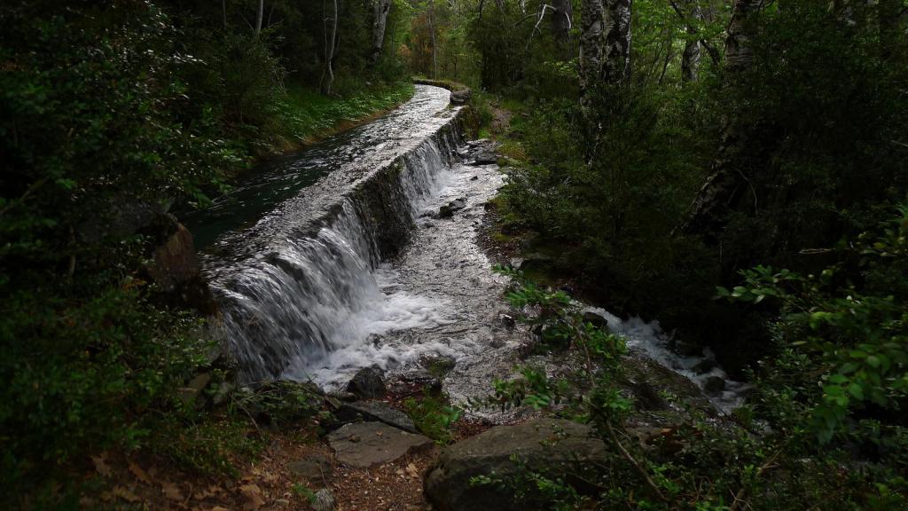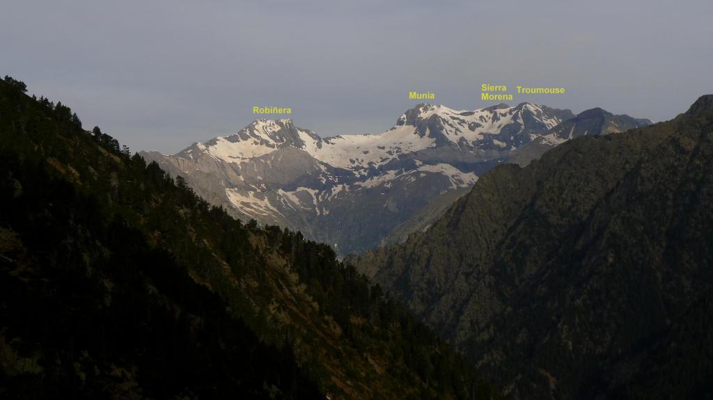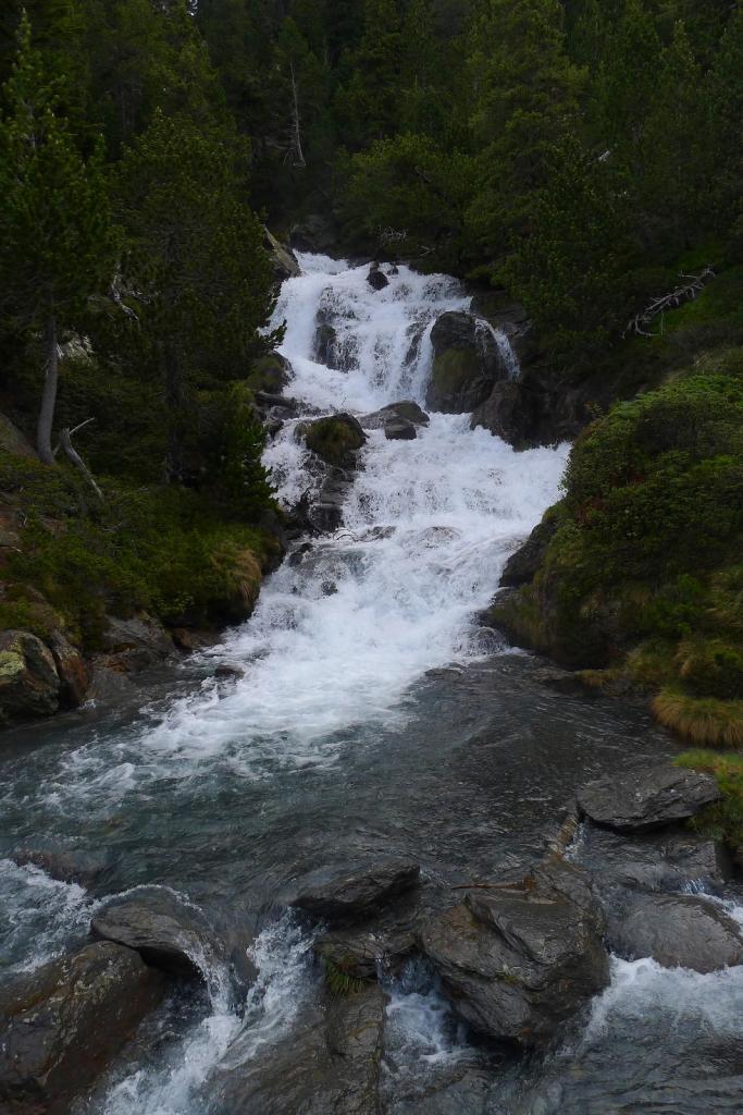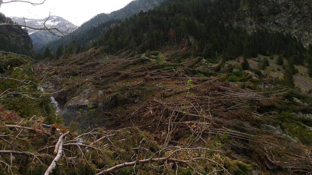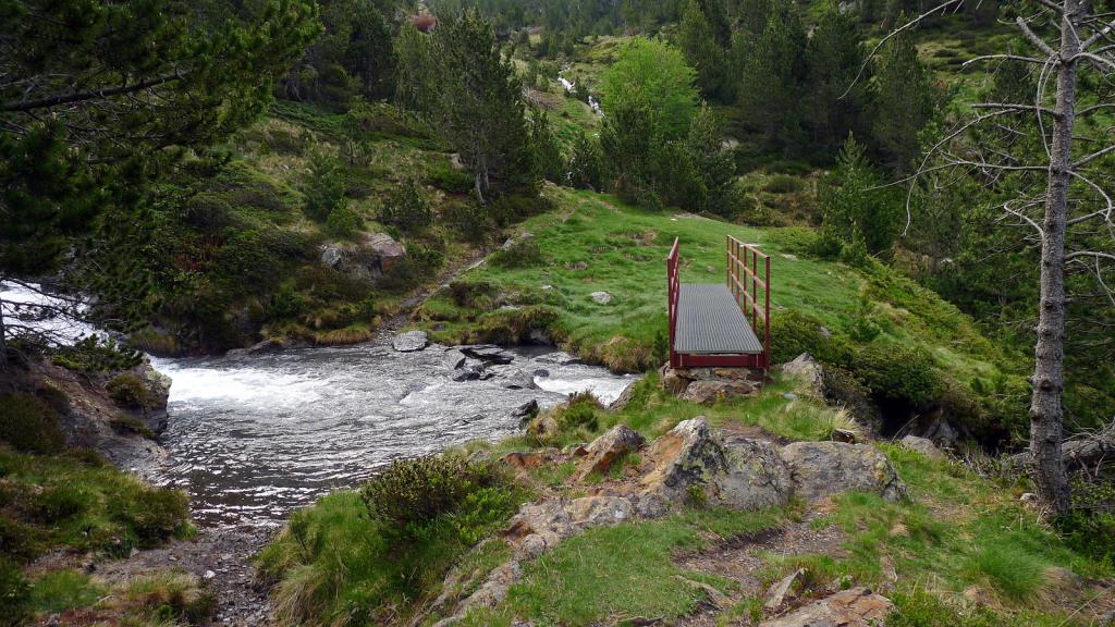 Justo antes de llegar al km.87 de la carretera que va al túnel de Bielsa-Aragnouet se alza el edificio de la antigua aduana (1290m) donde se puede aparcar. Allí está el cartel del PR 180 y un puente cruza el río Cinca. La senda, siempre balizada con marcas amarillas y blancas e hitos, asciende con decisión por el bosque, dominando al principio las frondosas y luego los pinos, a la orilla derecha del barranco de Tringoniero. Se pasa sobre un canal que llevará el agua a la central de Barrosa, luego junto a la borda Ruela (1437m 0h17′). Un alud ha dejado una desolación de troncos barridos y otro barranco lateral todavía está cubierto por una lengua de nieve. El ruido del agua con sus rápidos y cascadas lo inunda todo. Sé que hay que pasar al otro lado del barranco y pienso que si no hay puente voy a tener que volverme.