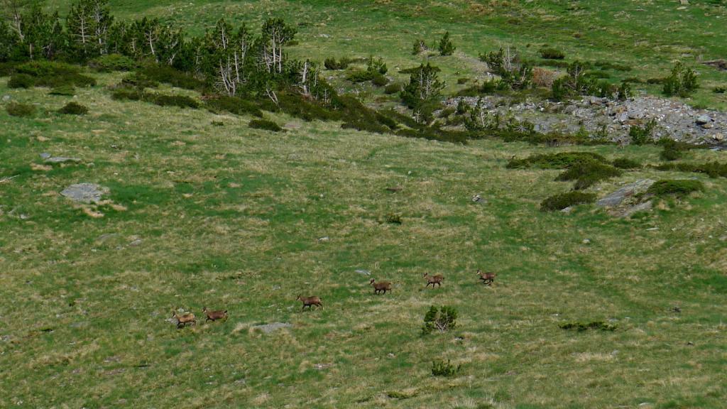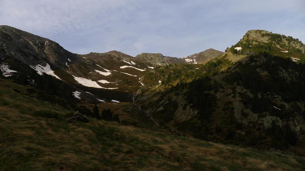 Siguiendo ese barranquito a mi derecha, se cruza a la orilla izquierda (1974m 1h32′). Hay hitos. Asciendo la ladera herbosa directamente hacia arriba hasta encontrarme con un sendero (2035m 1h39′). El sendero se dirige a la derecha (S) llaneando bajo la cara oeste del pico de la Espada, otra vez por bosquecillo, hasta girar hacia la izquierda (SE) y encarar otra ladera herbosa sin senda, así que hay que fijarse en los hitos. Esta subida me lleva a un rellano herboso que forma una especie de suave circo bajo el collado entre el pico de la Espada y la Peña de Alba. A mi derecha, aún lejos, se ve el circo de Mener.