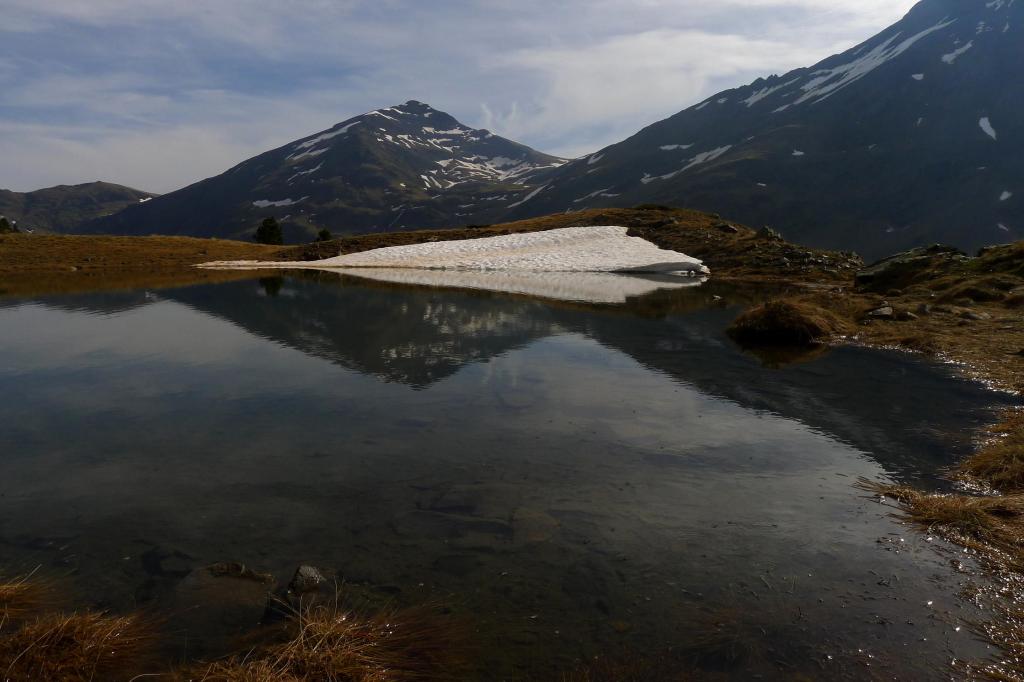 Dudo un poco porque hay que pasar un barranco, sin problemas, pero luego veo una ladera cubierta de rododendros, con neveros y no vislumbro senda alguna; así que voy por donde creo que es más cómodo e intento progresar justo por debajo de los neveros. Enseguida veo algo más arriba lo que parece un sendero, asciendo decididamente y Voilà! un camino (2202m 2h26′) faldea cómodamente, pasando algún nevero sencillo y alguna pedrera, hasta el primer ibón de Mener (2261m 2h36′).
