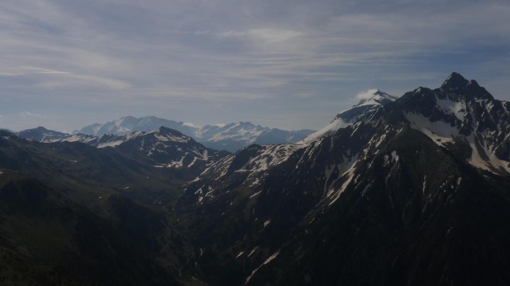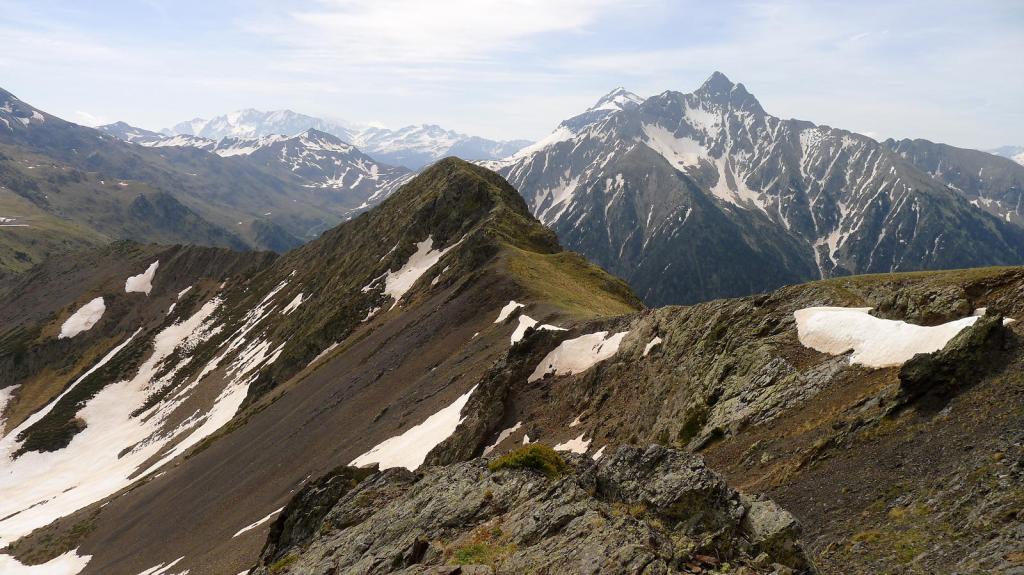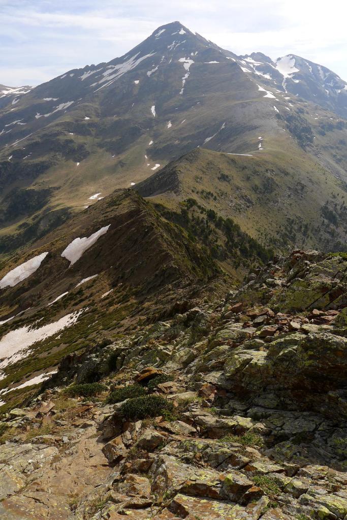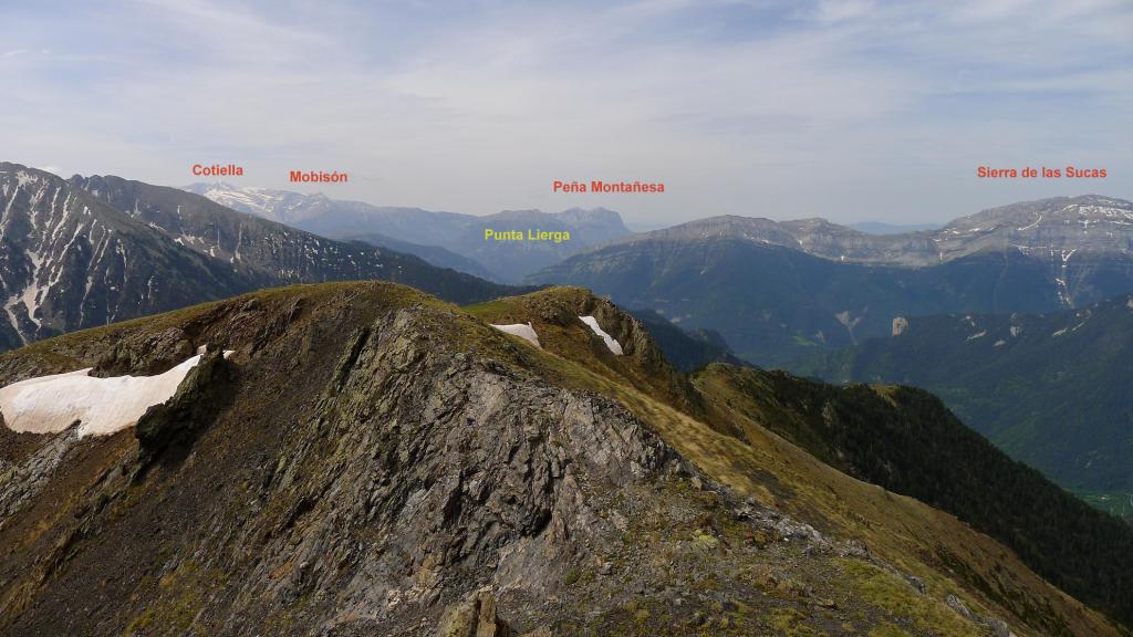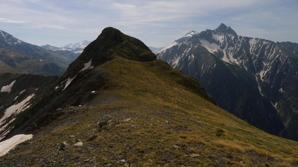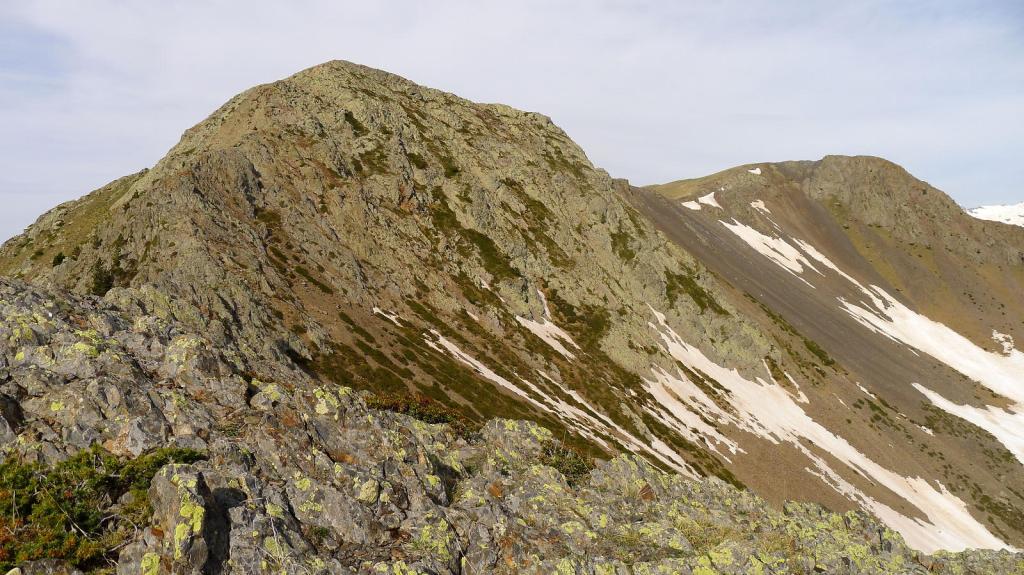 El acceso al primer pico lo visualizo por el hombro con rododendros, hierba y piedrilla que llega a la izquierda (cresta NE) del pico Oriental. La cresta desciende un brecha y después asciende directamente hacia el pico por afilada roca esquistosa, bastante segura, ningún paso difícil, pero siempre manteniendo el esfuerzo y la atención. Pico Mener Oriental (2451m 3h10′).