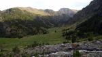 Siguiendo ese barranquito a mi derecha, se cruza a la orilla izquierda (1974m 1h32′). Hay hitos. Asciendo la ladera herbosa directamente hacia arriba hasta encontrarme con un sendero (2035m 1h39′). El sendero se dirige a la derecha (S) llaneando bajo la cara oeste del pico de la Espada, otra vez por bosquecillo, hasta girar hacia la izquierda (SE) y encarar otra ladera herbosa sin senda, así que hay que fijarse en los hitos. Esta subida me lleva a un rellano herboso que forma una especie de suave circo bajo el collado entre el pico de la Espada y la Peña de Alba. A mi derecha, aún lejos, se ve el circo de Mener.
