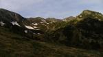 Dudo un poco porque hay que pasar un barranco, sin problemas, pero luego veo una ladera cubierta de rododendros, con neveros y no vislumbro senda alguna; así que voy por donde creo que es más cómodo e intento progresar justo por debajo de los neveros. Enseguida veo algo más arriba lo que parece un sendero, asciendo decididamente y Voilà! un camino (2202m 2h26′) faldea cómodamente, pasando algún nevero sencillo y alguna pedrera, hasta el primer ibón de Mener (2261m 2h36′).