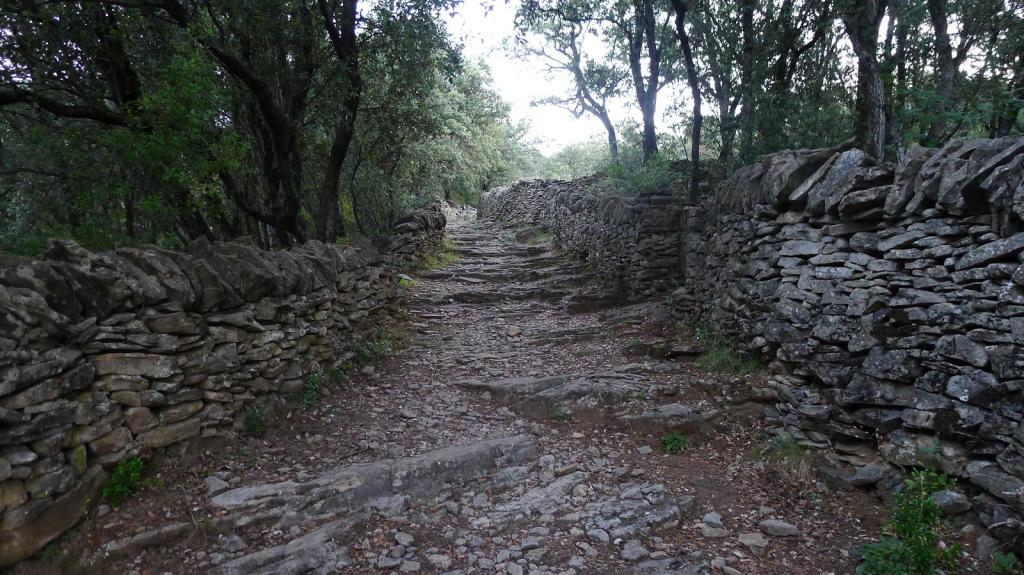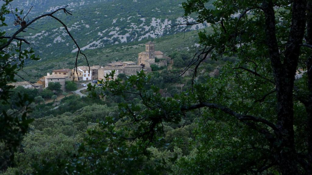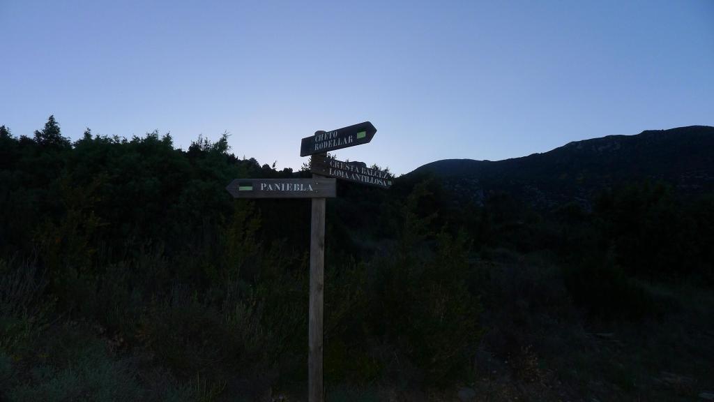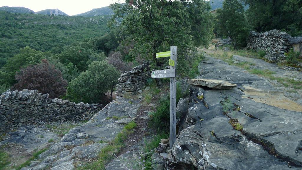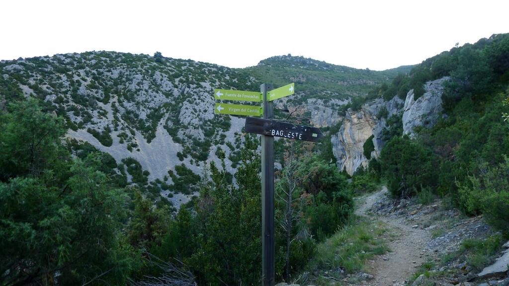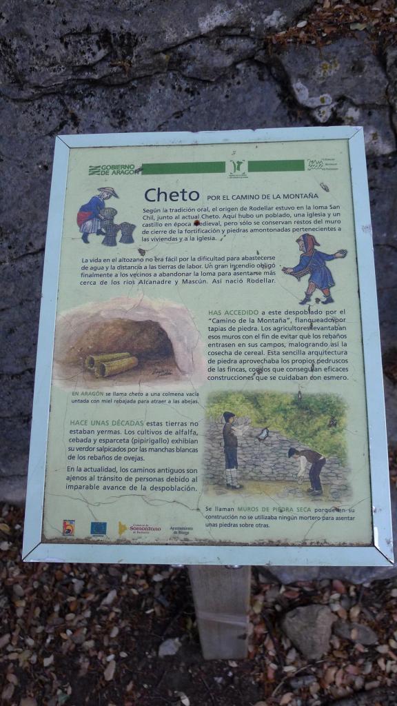 A la entrada de Rodellar (750m) hay un pequeño aparcamiento. Antes de entrar en el casco del pueblo un camino a la derecha indica Virgen del Castillo y Cheto. Me introduzco por un sombrío camino bordeado de muretes de piedra, entre encinas y quejigos, que asciende a la aldea de Cheto (810m 0h11′). En la siguiente desviación voy a la izquierda (833m 0h20′) hacia los pozos de Bagüeste (aquí llegaré en el descenso por el camino de la derecha). Después a la derecha (837m 0h26′) hacia Paniebla.