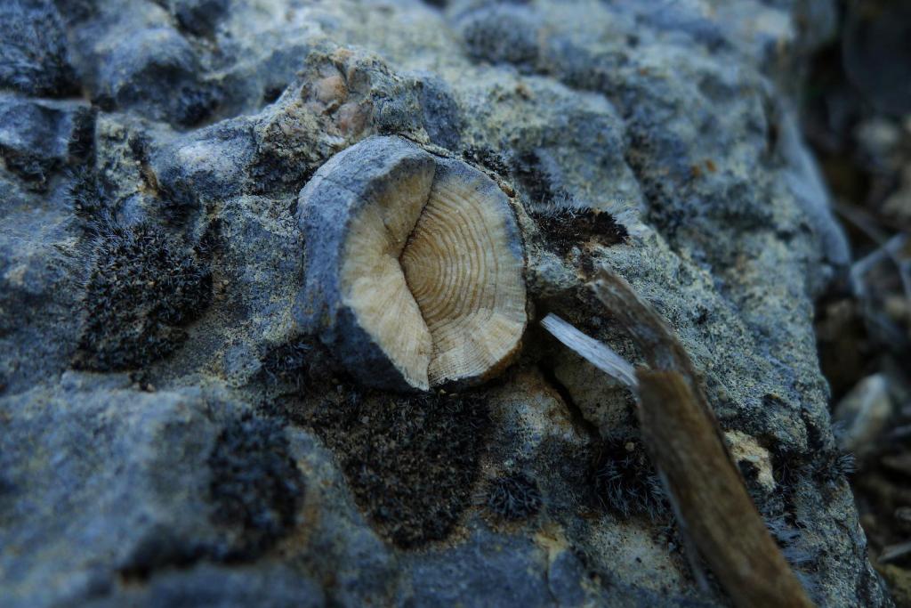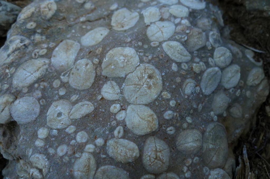 La senda se introduce en el barranco de la Virgen. Más arriba se cierra con unas murallas de roca, pero la ruta gira a la izquierda y asciende sobre los lomos orientales del Mascún Inferior. La abundancia de fósiles de Nummulites llama la atención. Al cruzar el barranco de Fabar (1127m 1h31′) me desvío de nuevo a la derecha. En el ascenso tengo algunas vistas sobre el barranco de Mascún.