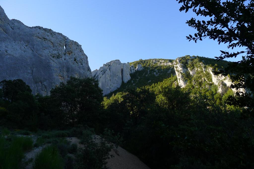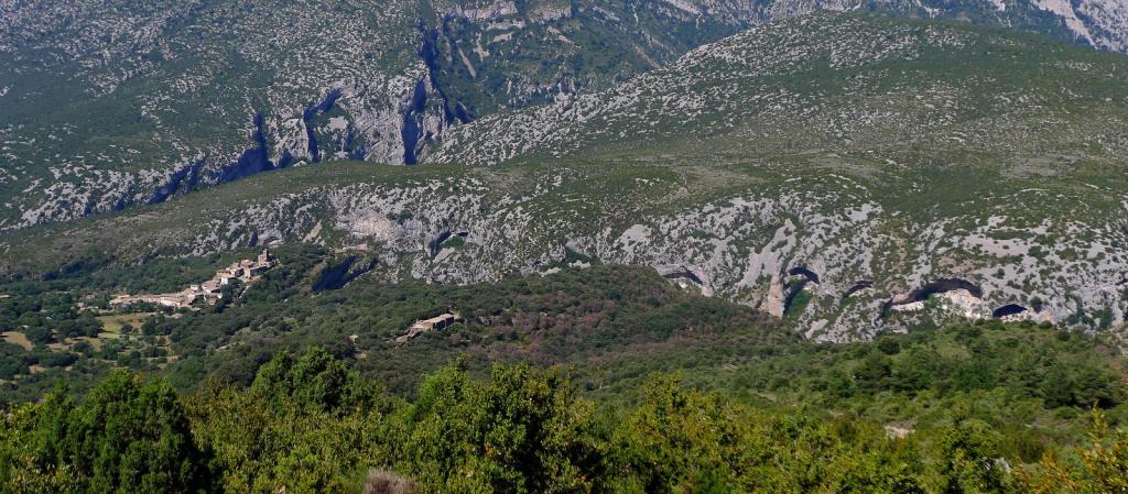 Continúo la cresta hacia el S al collado Balcés y después me desvío a la derecha (1485m 3h24′) por una senda que desciende bajo los muros de roca de la orilla derecha del barranco San Martín. Se pasa después a la orilla izquierda; a lo lejos ya se ve el pequeño pueblo de Rodellar. Una pedregosa senda, bien jalonada de hitos me lleva a entroncar con la ruta de ascenso (833m 4h27′). Después de pasar por Cheto llego de nuevo a Rodellar (750m 4h44′).
