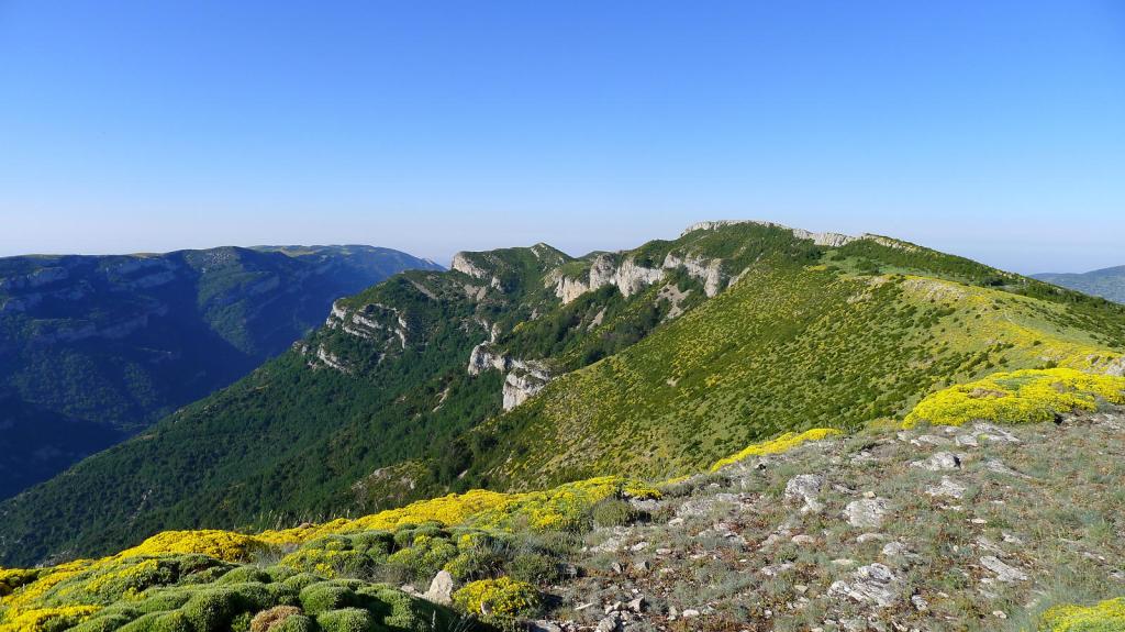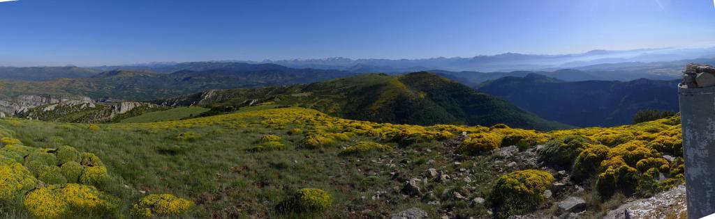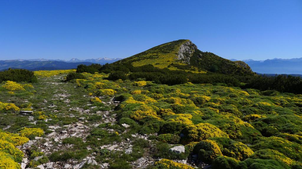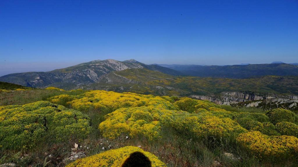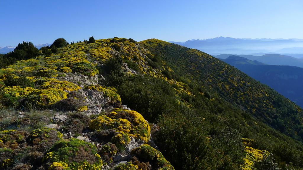En Rodellar termina la carretera que viene desde Bierge. Una de las rutas clásicas es la del barranco de Mascún, pero en esta ocasión mi intención es ascender los picos que se sitúan al NE de Rodellar, sobre la cresta E del profundo barranco del Balcés. Ruta bien señalizada y en esta época con los siempre abundantes erizones (Echinospartum) tapizando el monte del amarillo de sus flores