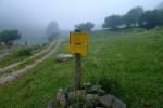 Del aparcamiento (1156m) salen tres pistas, tomo la de la izquierda que baja al río y lo atraviesa por un puente, para subir por el bosque de enfrente y llegar de nuevo a la pista a la derecha. En la próxima bifurcación se toma la derecha (1190m 0h11′) y sigo siempre cerca de la orilla derecha del Belonce, por hayedo y prados que se van alternando en la niebla. Entro en el Parque Nacional. El camino avanza llaneando bastante, hasta que tomo un giro a la izquierda subiendo con más fuerza a la cabaña d’Hortassy (1630m 1h18′), con el pastor ordeñando sus ovejas y los perros cuidando el rebaño. Empiezo a ver las cumbres cercanas por encima de la niebla.