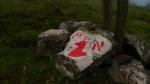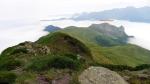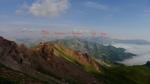 El camino bordea, en giro hacia el SW y W, el circo de la parte alta del Belonce, llegando a una especie de collado (1850m 1h49′) que da paso a los llanos de pasto donde se encuentra la cabaña Lapassa (1856m 2h00′), en la que solo hay unos burros y unos mulos. Continúo la senda hasta que, bajo el pic Rouge, me desvío a la izquierda (1950m 2h19′) para ascender por una vaguada herbosa y pedregosa. Más arriba empiezo a encontrar hitos, huella de paso y finalmente un paso claro que me dirige a una brecha, un paso fácil en la roca que requiere usar las manos y que da acceso a la cresta pcos metros antes de la cima del pic Rouge (2177m 2h42′). Se domina todo el recorrido que me queda por la cresta herbosa hasta el Labigouer, los dos valles tapados por la niebla, el de Belonce y el de Lhers, y todas las cumbres del maravilloso circo de Lescun y las del Aragón Subordán (valle de Echo).