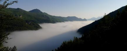 Huyendo de la ola de calor voy a hacer una rita circular por el valle de Aspe, en Francia, y me encuentro una densa niebla al pasar el túnel de Somport que me acompañará por toda la parte baja del valle donde se desarrolla la excursión. La ruta es larga y acumula mucho desnivel debido a las constantes subidas y bajadas. La única zona un poco más delicada es la parte final del ascenso al pic Rouge, aunque no es difícil; el resto es terreno más bien de pasto, en algunas zonas sin senderos; en el descenso desde el col des Pises a veces puede resultar confuso y el GPS ayuda bastante. Todo el recorrido es completamente solitario, la única persona que veo es el pastor de la cabaña de Hortassy.