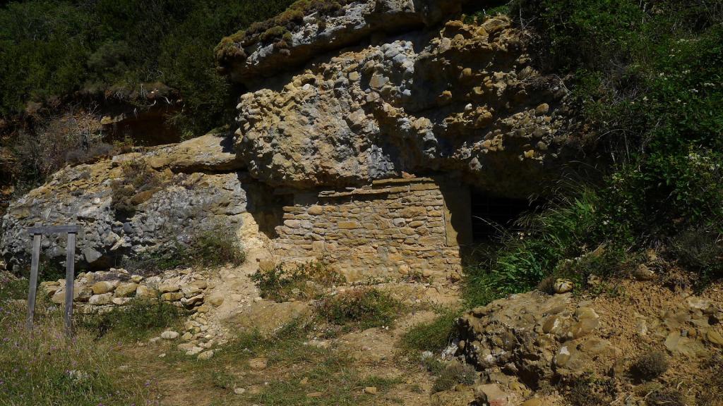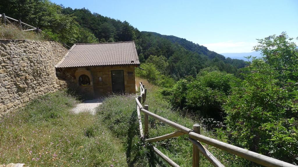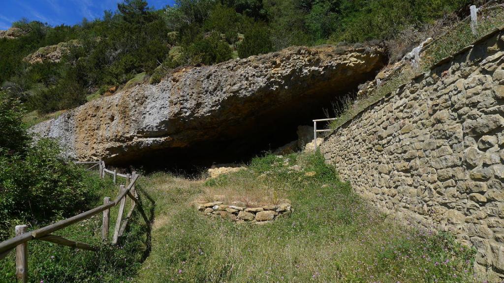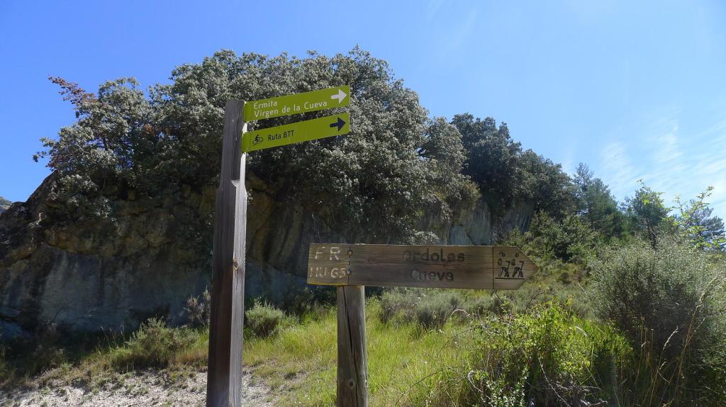 El camino asciende con varios giros, pasa una portilla (1360m 1h42′) y, muy poco después, termina la pista y comienza un sendero (1370m 1h45′) que discurre por la agradable sombra del bosque de pinos hasta la Ermita de la Virgen de la Cueva (1460m 2h04′). Allí hay un enclave eremítico bajo una visera de conglomerado y una pequeña ermita de nueva factura, además de amplias vistas hacia el sur, hacia las sierras exteriores del Pirineo.