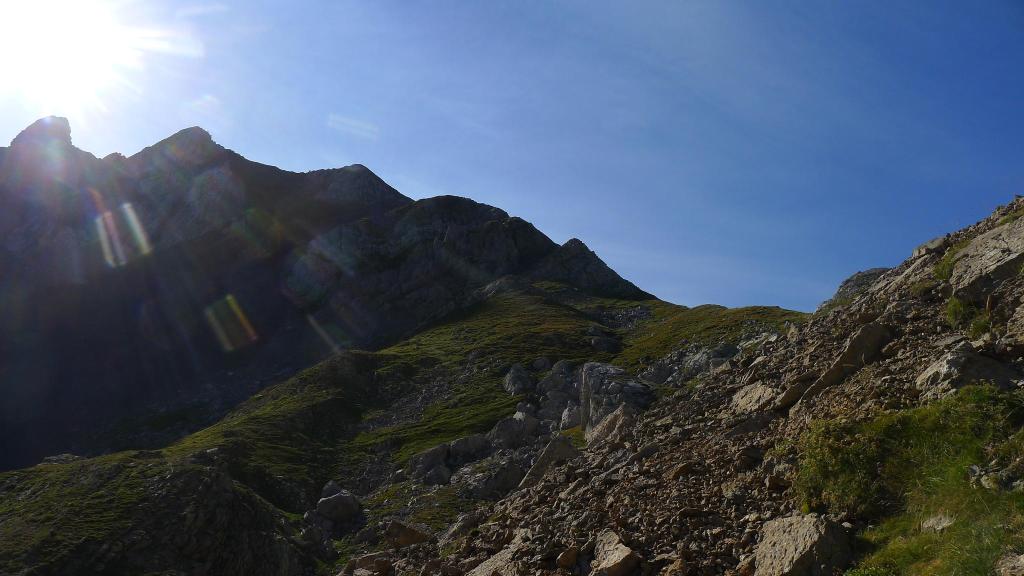 Antes de llegar a la cabaña de Peyrelue (hacia los 1780m) sale un mastín y me desvío ascendiendo por la ladera herbosa a mi izquierda. Faldeo por trazas de senda a unos 1880m paralelo al camino. Pero cuando ya iba desembocando en el camino GR, acercándome a la cabaña Dous Boués de Peyrelue, otro mastín sale a mi paso. Vuelvo a desviarme girando unos 350º y seguir ascendiendo por la ladera de hierba en dirección NNE