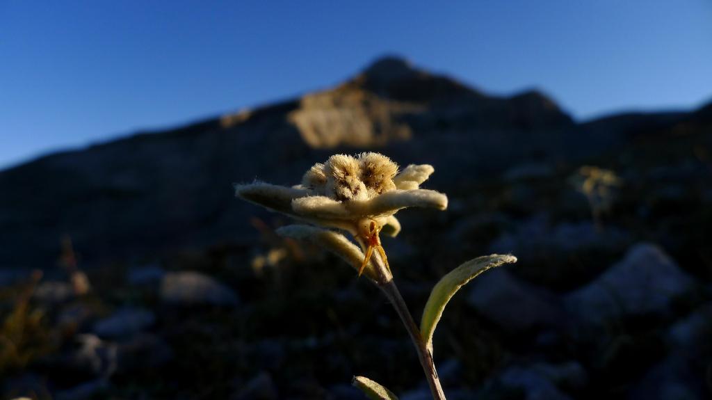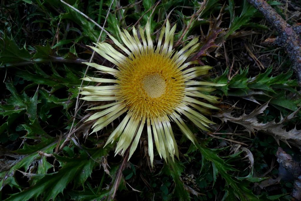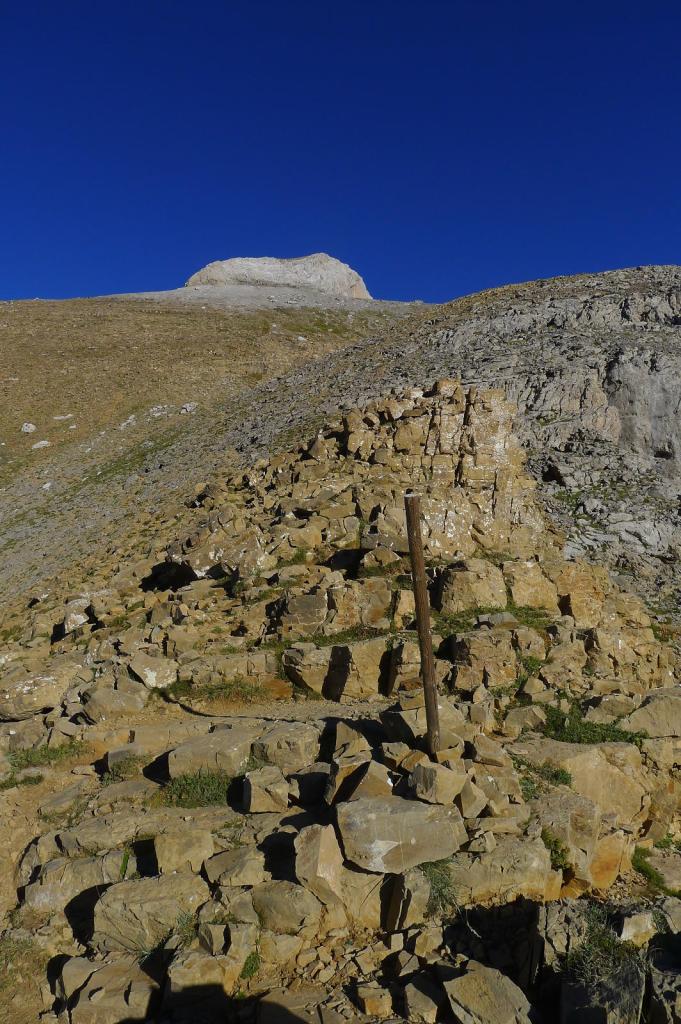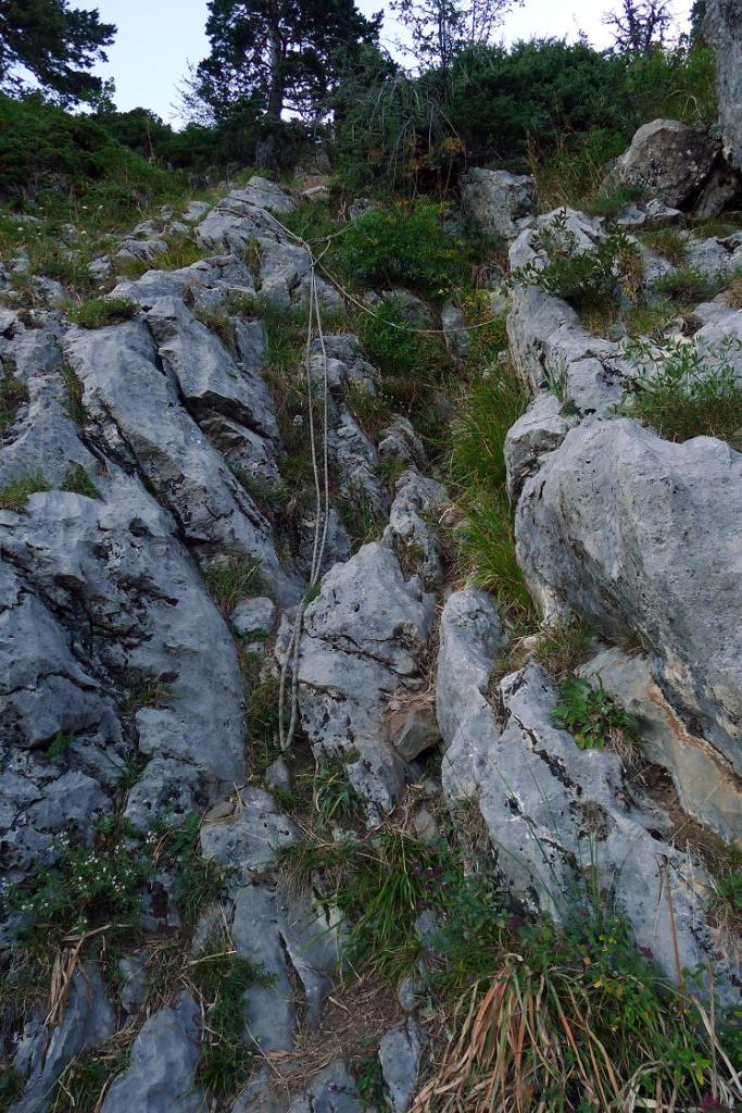 A la derecha sale un camino claro con un hito y sigue las marcas amarillo-verde. Se trata de un pinar clareado. Girando hacia el N llego a una canal con una cuerda fija (1885m 1h06′) para ayudar a superarla, es fácil, la cuerda es casi innecesaria. Continúa la canal rocosa y pedregosa, con fuerte pendiente pero sin trepar, hasta que se convierte en un lomo herboso donde la senda se difumina, hay hitos dispersos, se avanza recto sobre el lomo hasta un poste (2385m 1h50′) bien visible. Un poquito más arriba se bifurca a la derecha la ruta por la que descenderé.