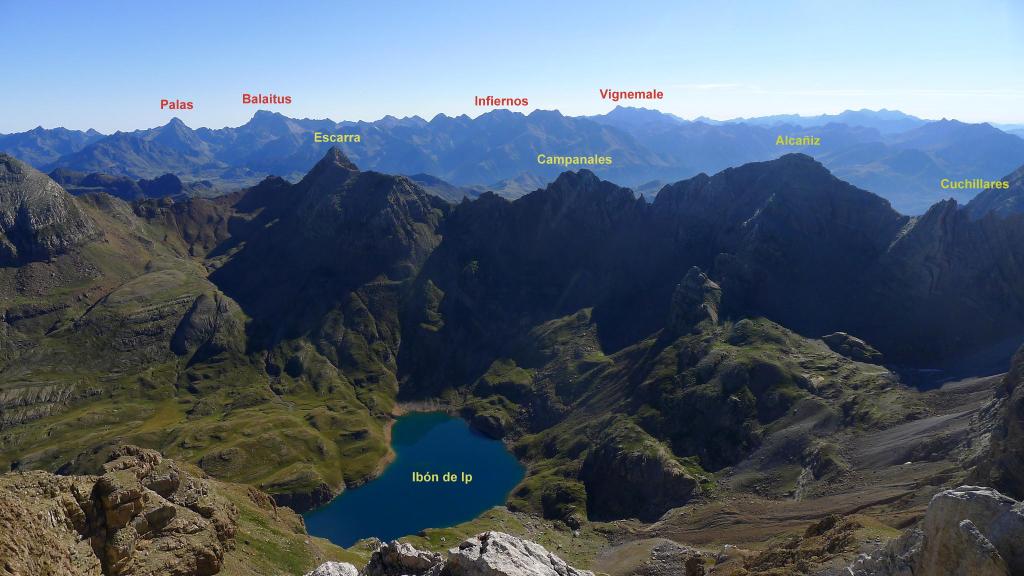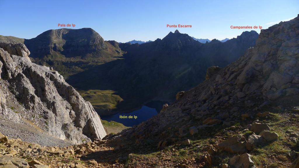 Al terminar la canal se entra en un circo (2472m 2h09′) o cubeta de lago colmatado. Enfrente tengo el collado de Ip, al que accedo por la subida pedregosa un poco hacia la derecha. Collado de Ip (2566 2h19′). La vista hacia el ibón de Ip, en la otra vertiente es una caída vertiginosa.