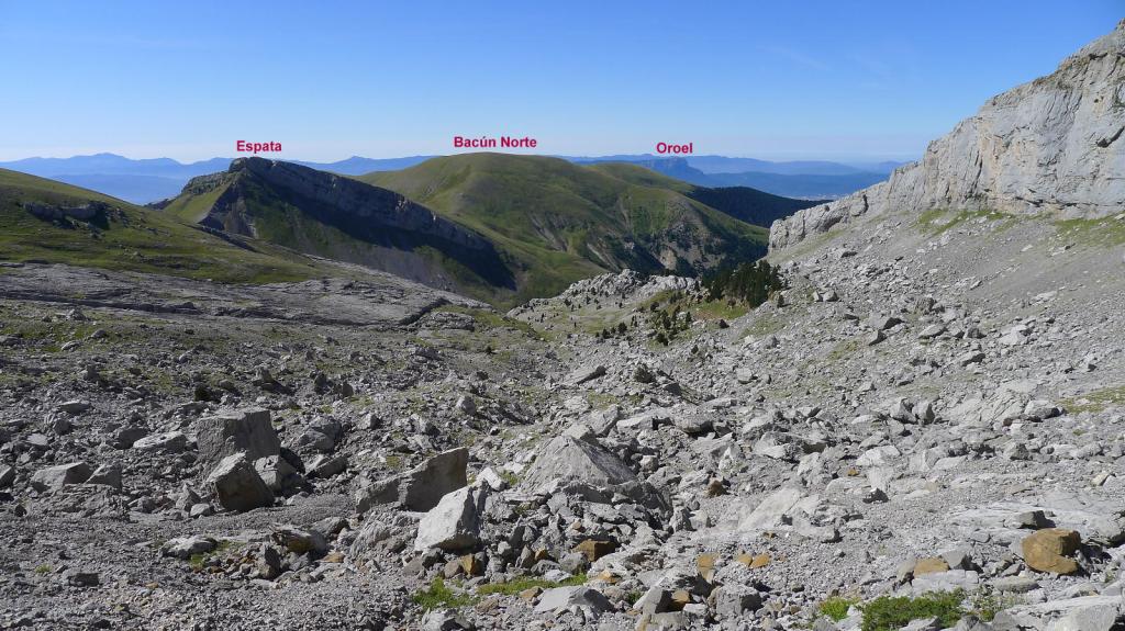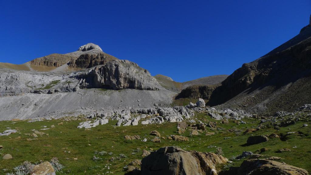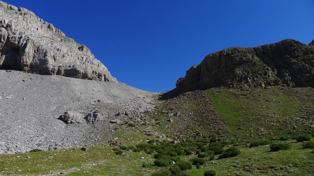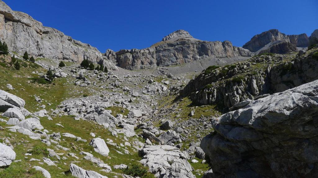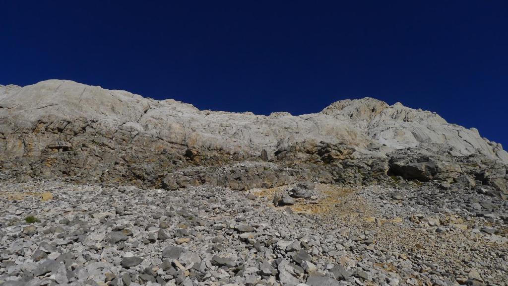 Se entra en una zona más llana, un lapiaz kárstico que se dirige hacia una amplia canal pedregosa, gris a la izquierda, parda a la derecha. Más a la derecha es una pendiente de hierba, que aprovecho para subir pegado a la roca de la derecha; aunque luego bajaré por la zona central, por la pedrera gris que tiene traza de senda marcada.