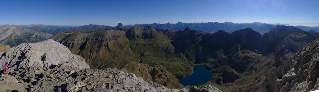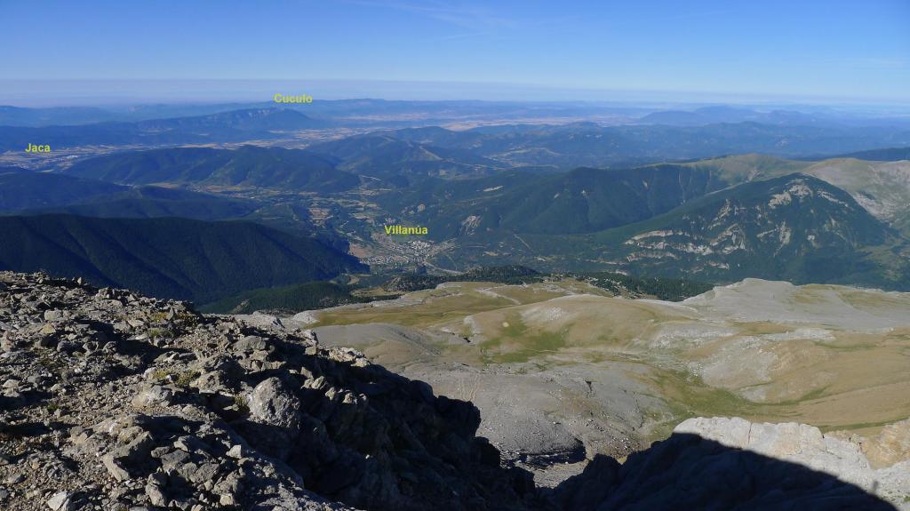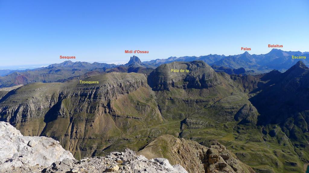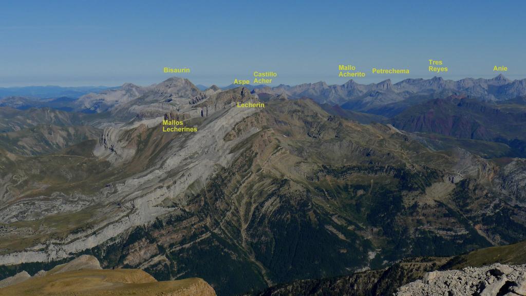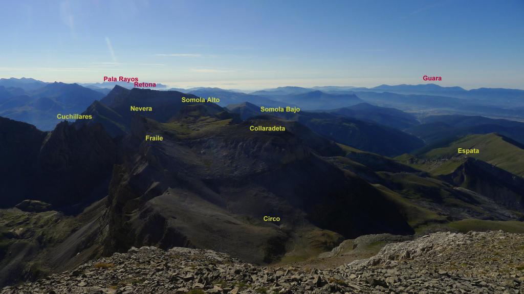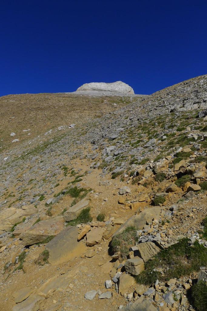 A la izquierda (NW) sale una senda, un poco hacia la ladera sur para evitar un espolón rocoso que se asoma al norte. La senda zigzaguea por el amplio lomo pedregoso que forma la arista SE del pico, acercándose a la pared (2800m 2h48′). La blanca pared rocosa impone, pero está bastante escalonada y los hitos marcan una ruta bien distinguible hasta la cima de Collarada (2883m 2h58′). Disfruto de magníficas vistas.