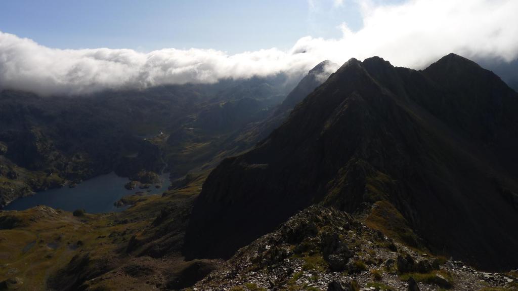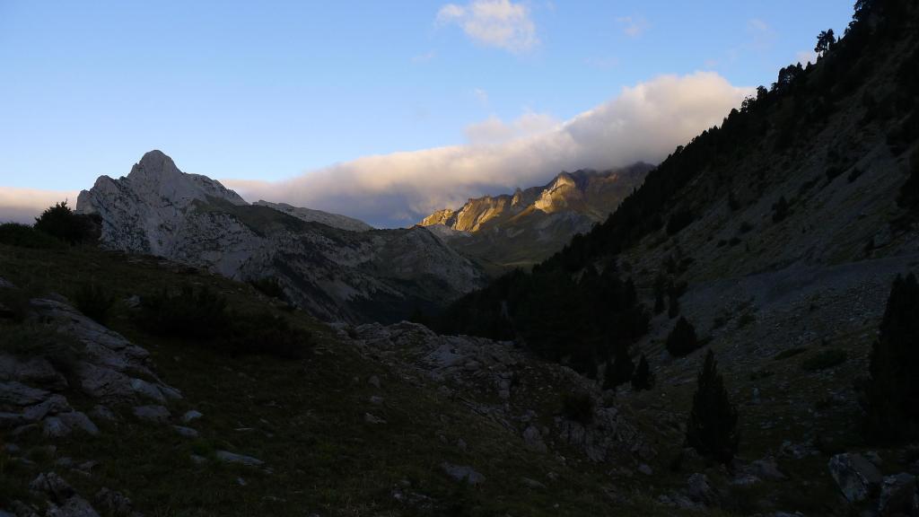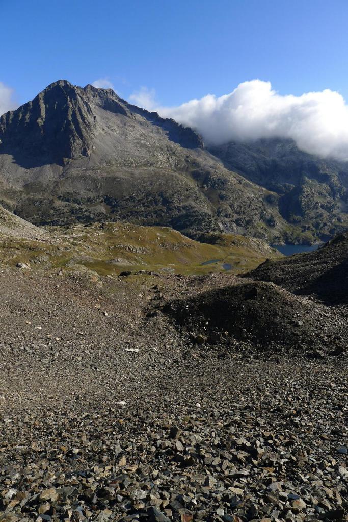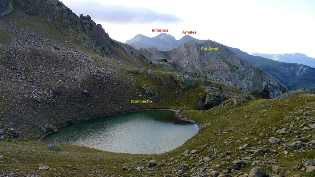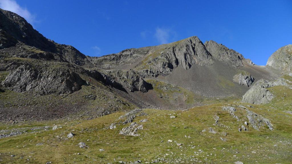 La cresta E de descenso al collado es fácil (Forqueta del Ibonciecho 2569m 2h49′). Hago un intento hacia la cresta del Sanchacollons, pero lo dejo enseguida porque me parece un poco complicada. Destrepo desde el collado hacia el N; hay un primer escalón más delicado, el camino al principio es escarpado, pero luego va más suave por la pedrera y está bien marcado. En zona ya herbosa se llega a una cubeta con unos pequeños ibones (2367m 3h26′), la senda es clara, con hitos, pero luego por la hierba se hace a veces difusa.