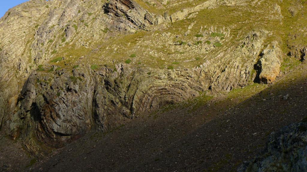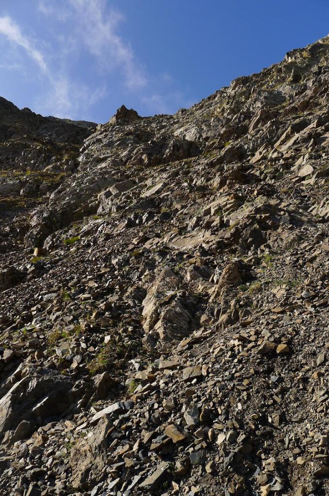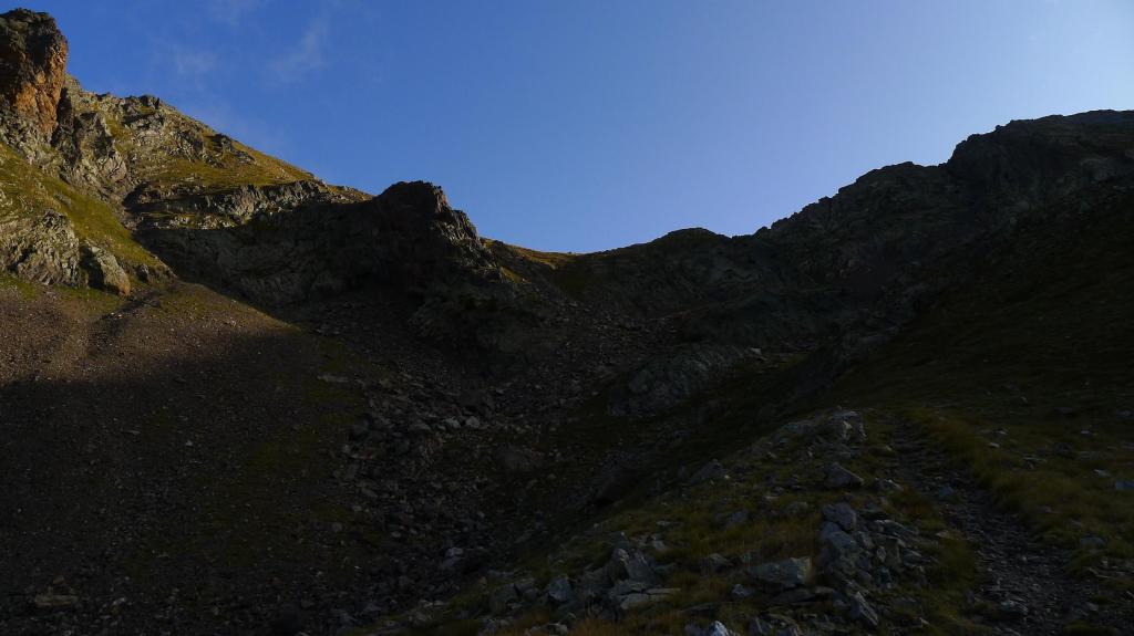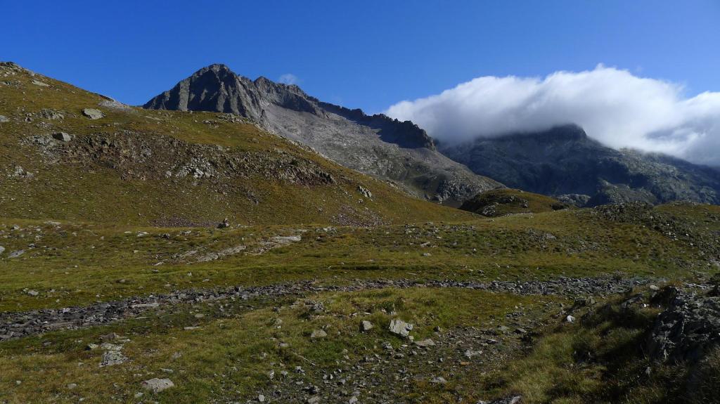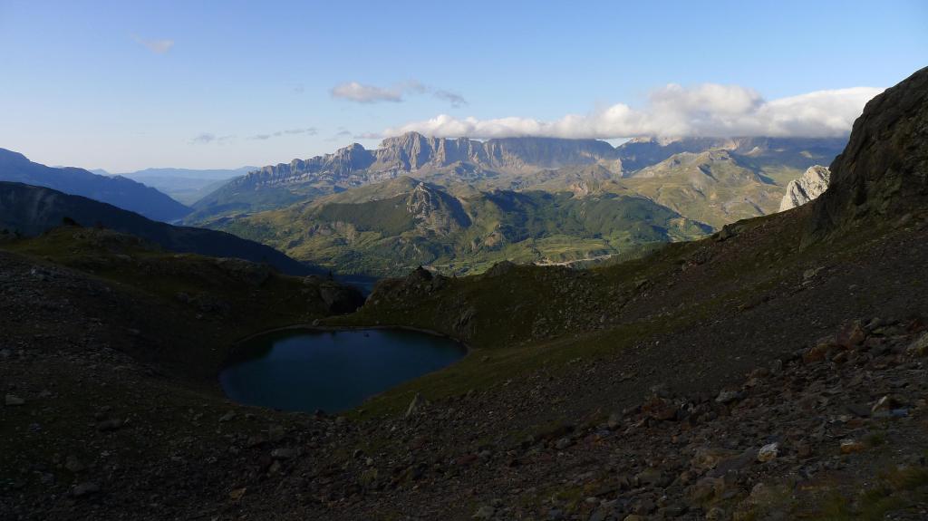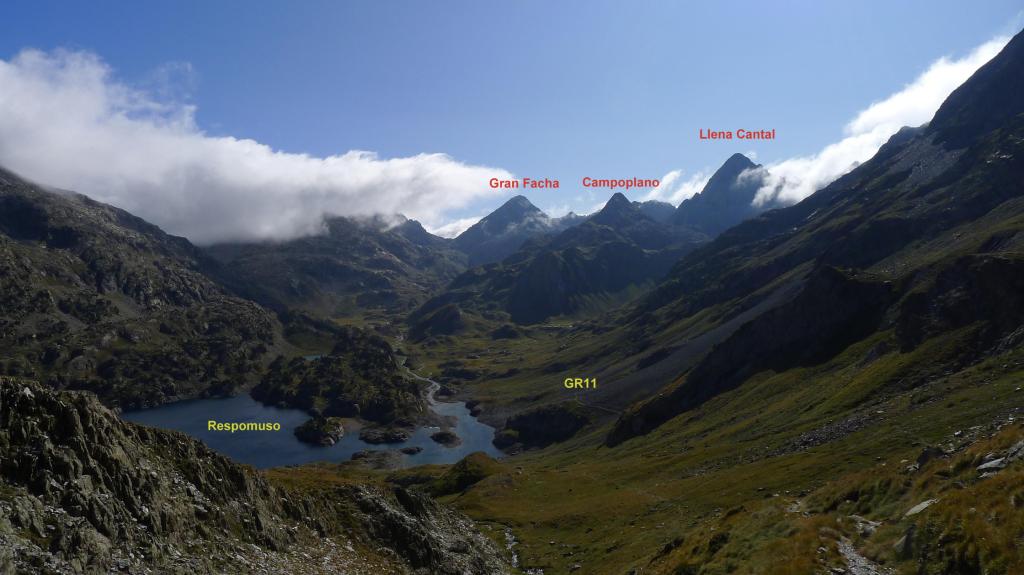 La cresta E de descenso al collado es fácil (Forqueta del Ibonciecho 2569m 2h49′). Hago un intento hacia la cresta del Sanchacollons, pero lo dejo enseguida porque me parece un poco complicada. Destrepo desde el collado hacia el N; hay un primer escalón más delicado, el camino al principio es escarpado, pero luego va más suave por la pedrera y está bien marcado. En zona ya herbosa se llega a una cubeta con unos pequeños ibones (2367m 3h26′), la senda es clara, con hitos, pero luego por la hierba se hace a veces difusa.