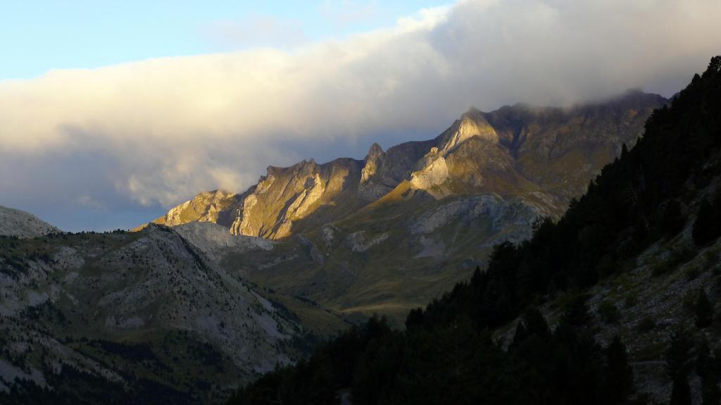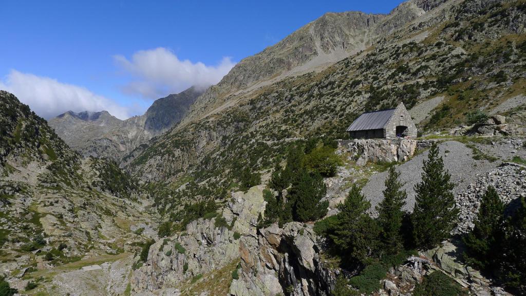Por fin empalmo con el GR-11 (2145m 3h46′) y siguiéndolo alcanzo la presa del Repomuso (2111m 4h22′), desde donde las vistas del lago y los picos de este gran circo son espléndidas. Pasada la presa hay que subir a la ermita de la Virgen de las Nieves y tengo una confusión con los caminos ya que me meto en la ruta hacia el Arriel, Palas y Balaitus, así que tengo que volver al GR. Ahora ya sólo hay que seguirlo descendiendo el valle de Aguas Limpias, que es muy bonito pero se me hace un poco pesado; además hay un montón de gente subiendo. Se deja a la derecha el desvío a los ibones de Arriel (1757m 5h22′) y el desvío al col de Soba (1635m 5h40′). Después se llega al aparcamiento de la Sarra (1435m 6h10′), que está repleto de coches, y por la carretera hasta donde tengo yo el coche (1437m 6h20′).