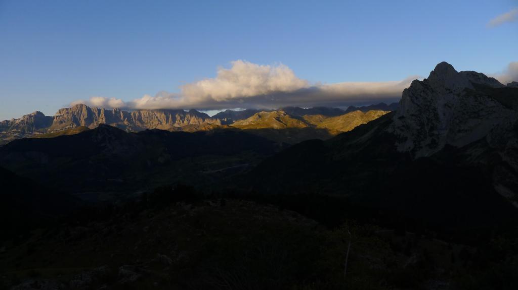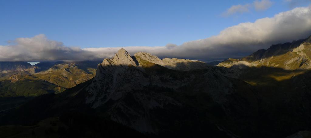 Me introduzco en la cubeta del Ibonciecho (2258m 1h49′) pasando por su izquierda un poco por encima, con una buena vista del valle de Tena por debajo y, enseguida, con una vista del collado por encima, ascendiendo por un camino claro con hitos por zona más rocosa. Dejo la senda y me voy hacia la izquierda (2539m 2h18′) para subir recto por una fuerte pendiente de hierba y piedrilla en la ladera S del Musales que me lleva directamente a la cima (Musales 2653m 2h24′). El viento es sumamente frío, me abrigo bien y aguanto poco en la cumbre.
